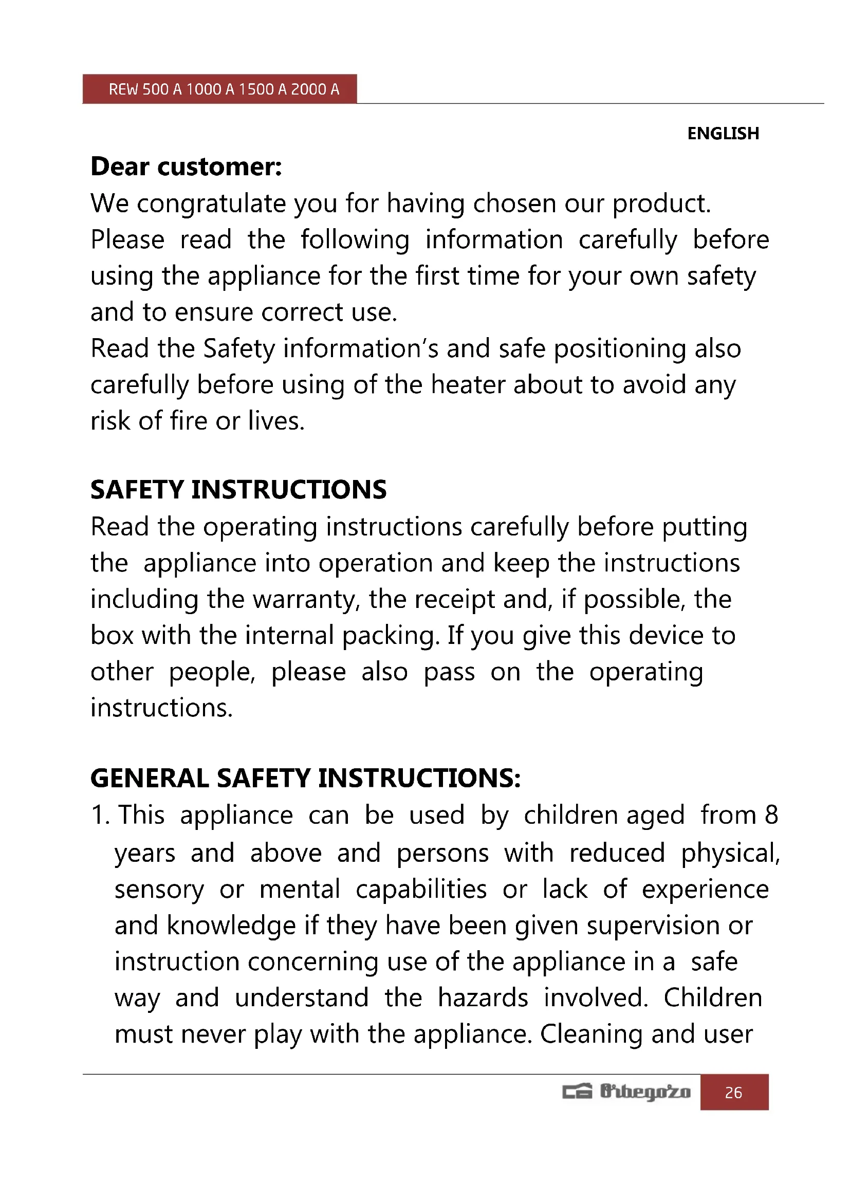 ENGLISH Dear customer: We congratulate you for having chosen our product. Please read the following information carefully before using the appliance for the first time for your own safety and to ensure correct use. Read the Safety information’s and safe positioning also carefully before using of the heater about to avoid any risk of fire or lives. SAFETY INSTRUCTIONS Read the operating instructions carefully before putting the appliance into operation and keep the instructions including the warranty, the receipt and, if possible, the box with the internal packing. If you give this device to other people, please also pass on the operating instructions. GENERAL SAFETY INSTRUCTIONS: