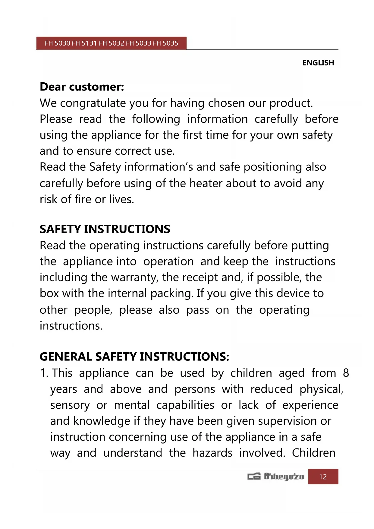 ENGLISH Dear customer: We congratulate you for having chosen our product. Please read the following information carefully before using the appliance for the first time for your own safety and to ensure correct use. Read the Safety information’s and safe positioning also carefully before using of the heater about to avoid any risk of fire or lives. SAFETY INSTRUCTIONS Read the operating instructions carefully before putting the appliance into operation and keep the instructions including the warranty, the receipt and, if possible, the box with the internal packing. If you give this device to other people, please also pass on the operating instructions. GENERAL SAFETY INSTRUCTIONS: