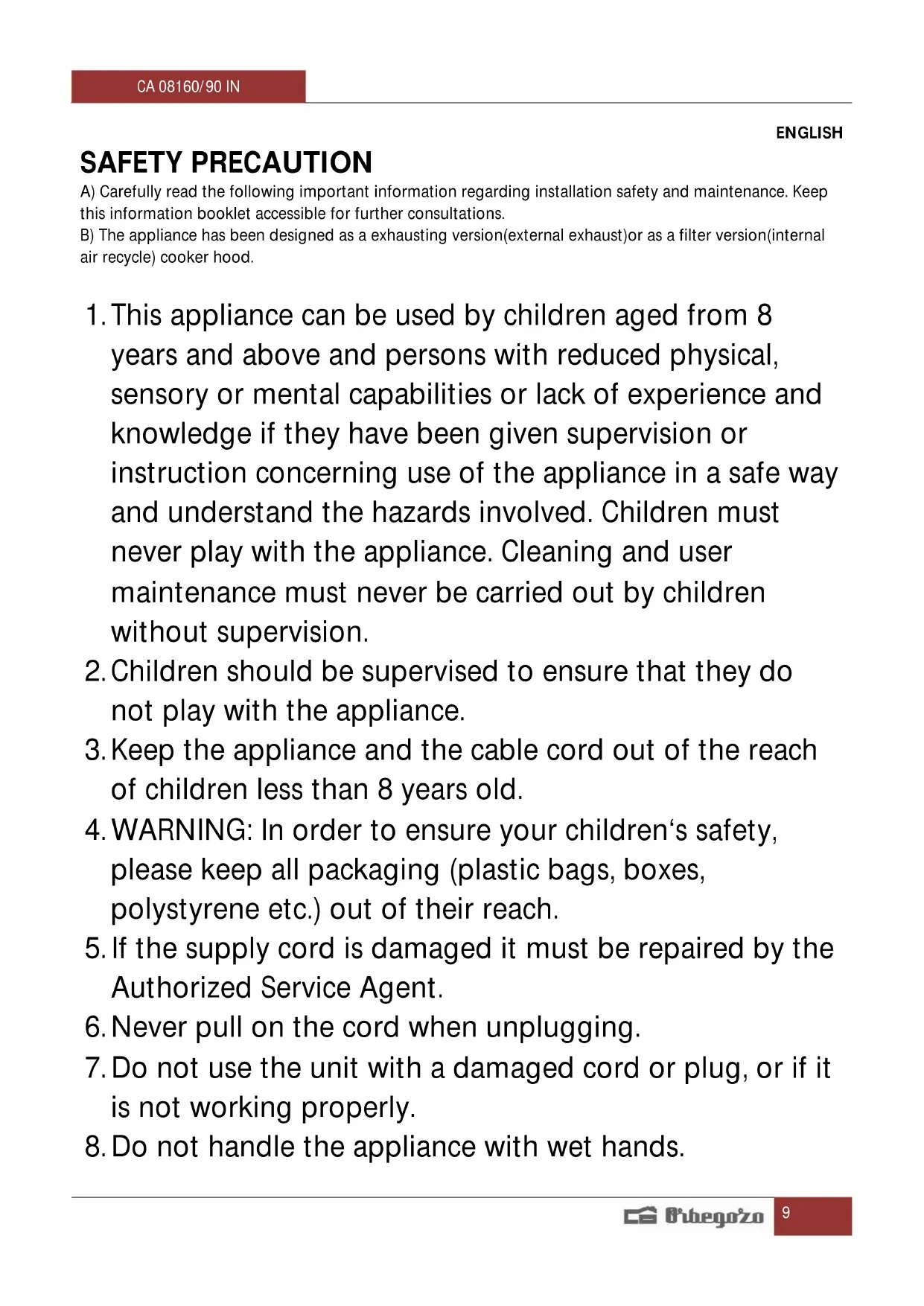 ENGLISH SAFETY PRECAUTION A) Carefully read the following important information regarding installation safety and maintenance. Keep this information booklet accessible for further consultations. B) The appliance has been designed as a exhausting version(external exhaust)or as a filter version(internal air recycle) cooker hood.