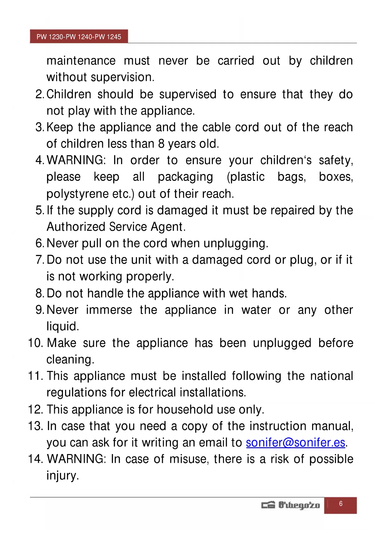 Find the device manual for free PW 1230 Orbegozo in PDF.