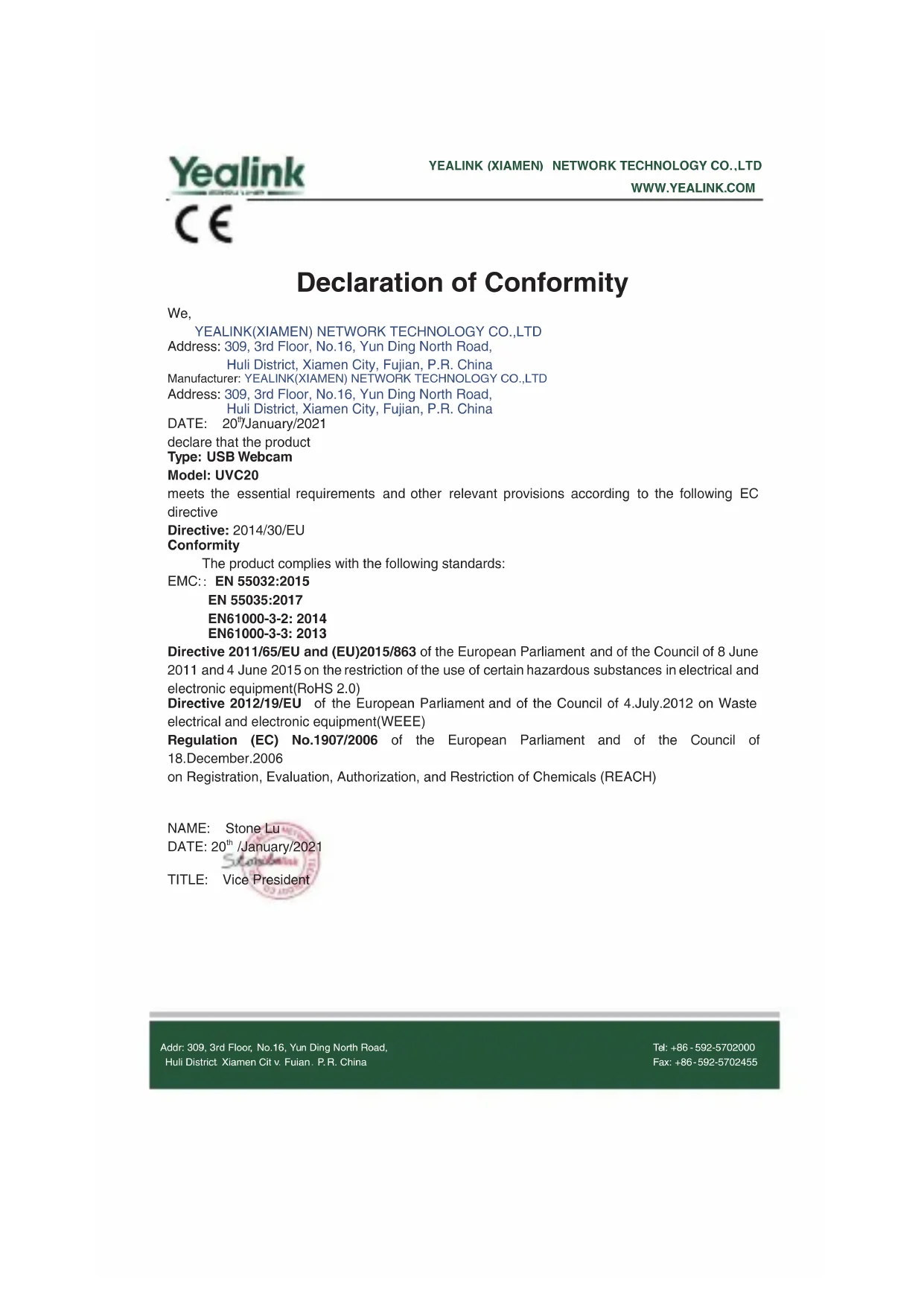 /January/2021 declare that the product Type: USB Webcam Model: UVC20 meets the essential requirements and other relevant provisions according to the following EC directive Directive: 2014/30/EU Conformity The product complies with the following standards: EMC::EN 55032:2015 EN 55035:2017 EN61000-3-2: 2014 EN61000-3-3: 2013 Directive 2011/65/EU and (EU)2015/863 of the European Parliament and of the Council of 8 June 2011 and 4 June 2015 on the restriction of the use of certain hazardous substances in electrical and electronic equipment(RoHS 2.0) Directive 2012/19/EU of the European Parliament and of the Council of 4.July.2012 on Waste electrical and electronic equipment(WEEE) Regulation (EC) No.1907/2006 of the European Parliament and of the Council of 18.December.2006 on Registration, Evaluation, Authorization, and Restriction of Chemicals (REACH)