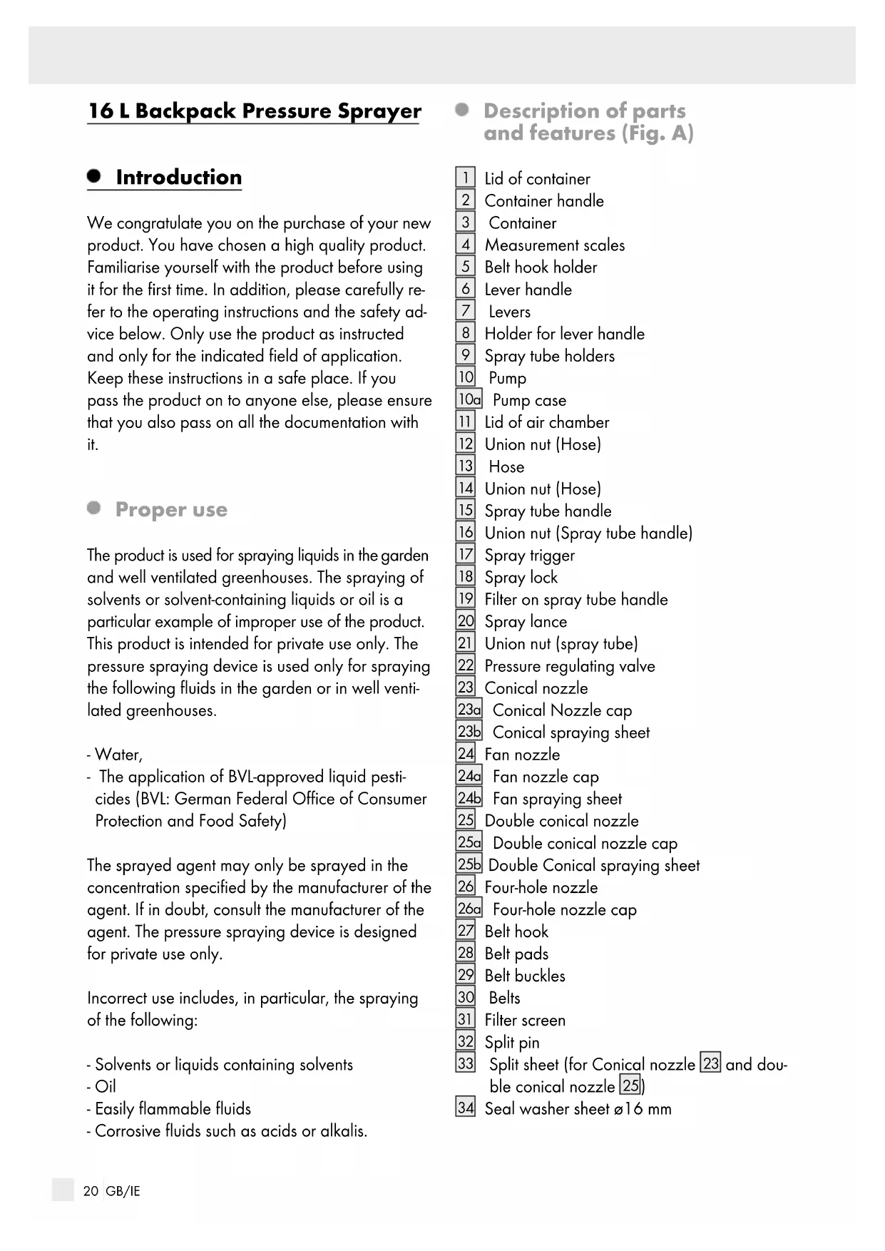 Included items 1 Garden pressure sprayer 1 Spray tube 1 Pair of carrying belts 1 Hose 1 Assembly, operating and safety instructions Spare parts: 1 Piston 4 Seal washer sheet ø 16mm 2 O-ring ø15 mm 2 O-ring ø18.5mm 2 Collets 1 Aligning buckle 1 Holder for lever handle Safety advice General safety advice KEEP ALL THE SAFETY ADVICE AND INSTRUC- TIONS IN A SAFE PLACE FOR FUTURE REFER- ENCE! Children or persons who lack the knowledge or experience to use the device or whose physical, sensory or intellectual capacities are limited must never be allowed to use the device without supervision or instruction by a person responsible for their safety. Children must never be allowed to play with the device. Warehousing of pesticide. It shall be kept out of reach of children. Disposal of pesticide shall follow the safety instructions furnished its man- ufacturer22 GB/IE Keep spraying requirement away from children and young persons under 16. Do not leave the device unattended while it is in operation. Use the device as intended! Secure the device during transport to prevent the spray liquid escaping. Examine the product before each use, ensure it is free of damages, con- gestions and all parts work as intended. Rubber parts such as the hoses or O-rings must not show any cracks or appear porous. Pay par- ticular attention to the safety devices. Ensure all connections are fitted tightly. Examine the product before first use after winter. CAUTION: Do not use the product if any visible damage or loss of functionality. Always place the device on an even, flat sur- face. During the sprayer is being filled, adjusted, used, transported, emptied, cleaned or maintained. Protect yourself with suitable personal protective equipment (PPE). Wear eye protection ( goggles or face shield ) Wear respiratory protection and appropriate protective clothing Wear water-proof glove and rubber boots Read the instruction handbook Keep bystanders away when spraying Only use spare parts and accessories provided by the manufacturer (pls. follow the step of “Exchange of spare parts included“ described in the manual). All other repairs shall only be carried out by the manufacturer, its service agent or similarly qualified persons. Improper maintenance can lead to a hazardous situation. Wash your hands and face after each spray- ing session. In case of intoxication via skin contract, please rinse with water immediately and consult doc- tor advice.