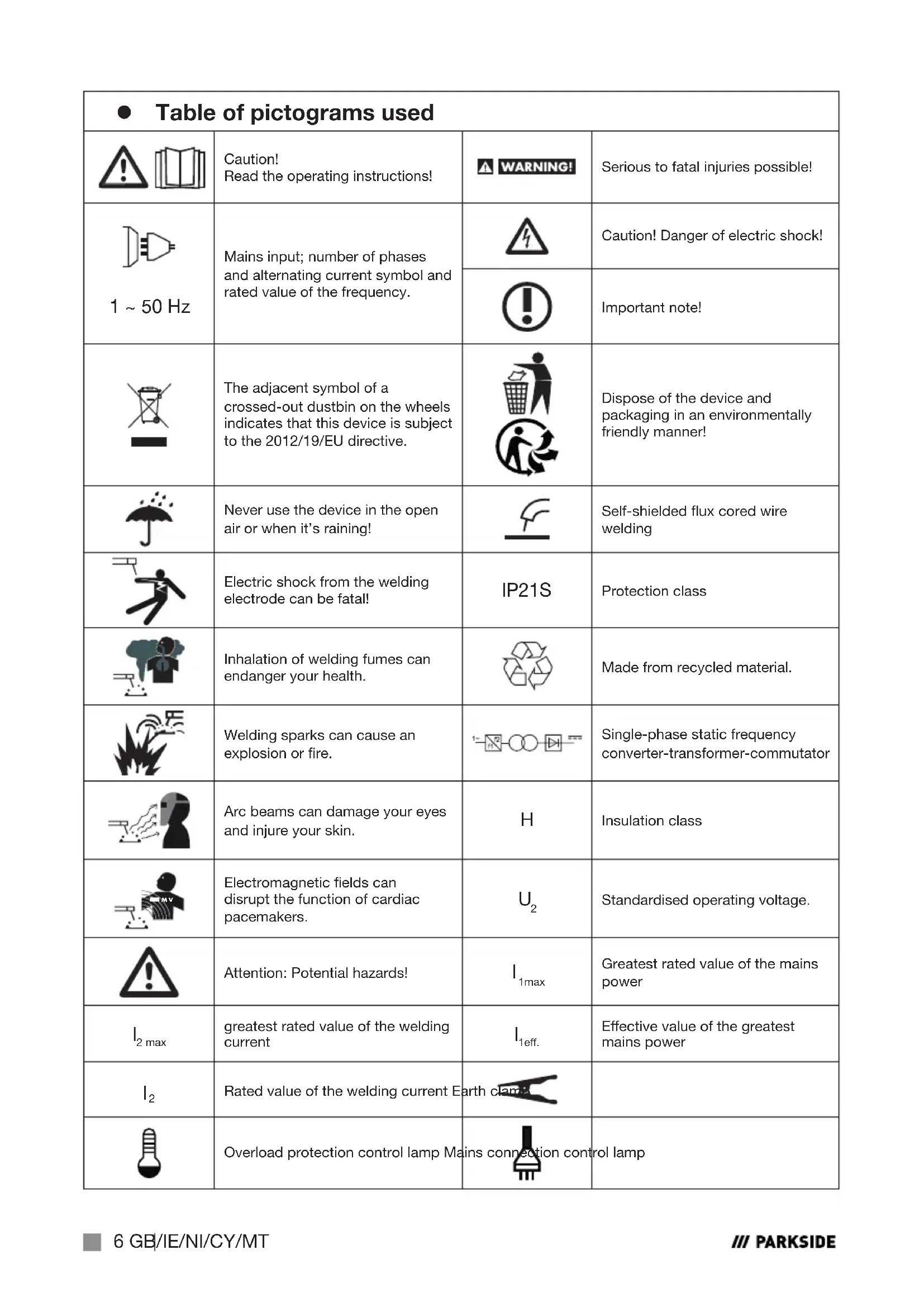 Welding wire reel max.: approx. 1000 g Welding wire diameter max.: 1.0 mm Fuse: 16 A Recommended material thickness: 0.8–3.0 mm Technical and visual changes may be made in further development without notifying the customer. Alldimensions, notices and specications in the operating instructions are therefore subject to change. The operating instructions cannot therefore be used as the basis for asserting a legal claim. z Safety instructions Please read the operating instructions with care and observe the notes described. Familiarise yourself with the device, its proper use and the safety instructions using these operating instructions. The rating plate contains all technical data of this welder; please learn about the technical features of this device. Repairs and/or maintenance work must only be carried out by qualied electricians. Only use the welding cables provided in the scope of delivery. During operation, the device should not be positioned directly against the wall, covered or jammed between other devices so that sucient air can always be absorbed through the ventila- tion slats. Make sure that the device is correctly connected to the mains voltage. Avoid any form of tensile stress of the power cable. Disconnect the mains plug from the socket prior to setting up the device in another location. If the device is not in operation, always switch it o by pressing the ON/OFF switch. Place the electrode holder on an insulated surface and only remove the electrodes from the holder after allowing it to cool down for 15 minutes. Pay attention to the condition of the welding cable, torch and the earth clamps. Wear and tear of the insulation and the live parts can lead to hazards and reduce the quality of the welding work. 472024_2407_Inverter-Fülldrahtschweißgerät_LB8_content.indb 9472024_2407_Inverter-Fülldrahtschweißgerät_LB8_content.indb 9 18.10.2024 10:05:1418.10.2024 10:05:1410 GB/IE/NI/CY/MT Arc welding creates sparks, molten metal parts and smoke. Therefore ensure that: All ammable substances and/or materials are removed from the work station and its immediate surrounding. Ensure the workplace is ventilated. Do not weld on containers, vessels or tubes that contain or con- tained ammable liquids or gases. WARNING! Avoid any form of direct contact with the welding current circuit. The no-load voltage between the electrode holder and earth clamp can be dangerous, there is a risk of electric shock. Do not store the device in a damp or wet environment or in the rain. Protection rating IP21S is applicable in this case. Protect your eyes using the appropriate protective glasses (DIN level 9–10), which are fastened to the supplied welding mask. Wear gloves and dry protective clothing that are free of oil and grease to protect the skin from exposure to ultraviolet radiation of the arc. WARNING! Do not use the welding power source to defrost pipes. Please note: The light radiation emitted by the arc can damage eyes and cause burns to the skin. Arc welding creates sparks and drops of melted metal. The welded workpiece starts to glow and remains hot for a relatively long period of time. Therefore, do not touch the workpiece with bare hands. Arc welding can cause vapours to be released that may be hazardous to health. Be careful not to inhale these vapours. Protect yourself from the harmful eects of the arc and keep people that are not involved in the work away from the arc, maintaining a distance of at least 2 m. ATTENTION! During the operation of the welder, other consumers may expe- rience problems with the voltage supply depending on the net- 472024_2407_Inverter-Fülldrahtschweißgerät_LB8_content.indb 10472024_2407_Inverter-Fülldrahtschweißgerät_LB8_content.indb 10 18.10.2024 10:05:1418.10.2024 10:05:1411GB/IE/NI/CY/MT work conditions at the connection point. In case of doubt, please contact your energy supply company. During the operation of the welder, other devices may malfunc- tion, e.g. hearing aids, cardiac pacemakers, etc. z Potential hazards during arc welding There are a series of potential hazards that can occur during arc welding. It is therefore particularly important for the welder to observe the following rules to avoid endangering him/herself and others and to prevent damage to people and the device. Work on the voltage side, e.g. on cables, plugs, sockets etc., may only be carried out by qualied electricians according to national and local regulations. In the event of accidents, disconnect the welder from the mains voltage immediately. If electrical contact voltages occur, switch o the device immedi- ately and have it checked by a qualied electrician. Always ensure good electrical contacts on the welding current side. Always wear insulating gloves on both hands during welding work. These provide protection from electrical shocks (no-load voltage of the welding current circuit), harmful radiations (heat and UV radiation) and incandescent metal and splashes of slag. Wear sturdy, insulating shoes. The shoes should also insulate when exposed to moisture. Loafers are not suitable as falling incandescent metal droplets can cause burns. Wear suitable protective clothing, no synthetic garments. Do not look into the arc without eye protection; only use a weld- ing mask with the prescribed protective glass as per DIN. In addition to light and heat radiation, which can dazzle or cause burns, the arc also emits UV radiation. Without suitable pro- tection the invisible ultraviolet radiation can cause very pain- ful conjunctivitis which is not apparent until several hours later. Furthermore, UV radiation can cause sunburn-like eects on unprotected parts of the body. 472024_2407_Inverter-Fülldrahtschweißgerät_LB8_content.indb 11472024_2407_Inverter-Fülldrahtschweißgerät_LB8_content.indb 11 18.10.2024 10:05:1418.10.2024 10:05:1412 GB/IE/NI/CY/MT Any persons in the vicinity of the arc or helpers must also be informed of the dangers and be equipped with the necessary protect