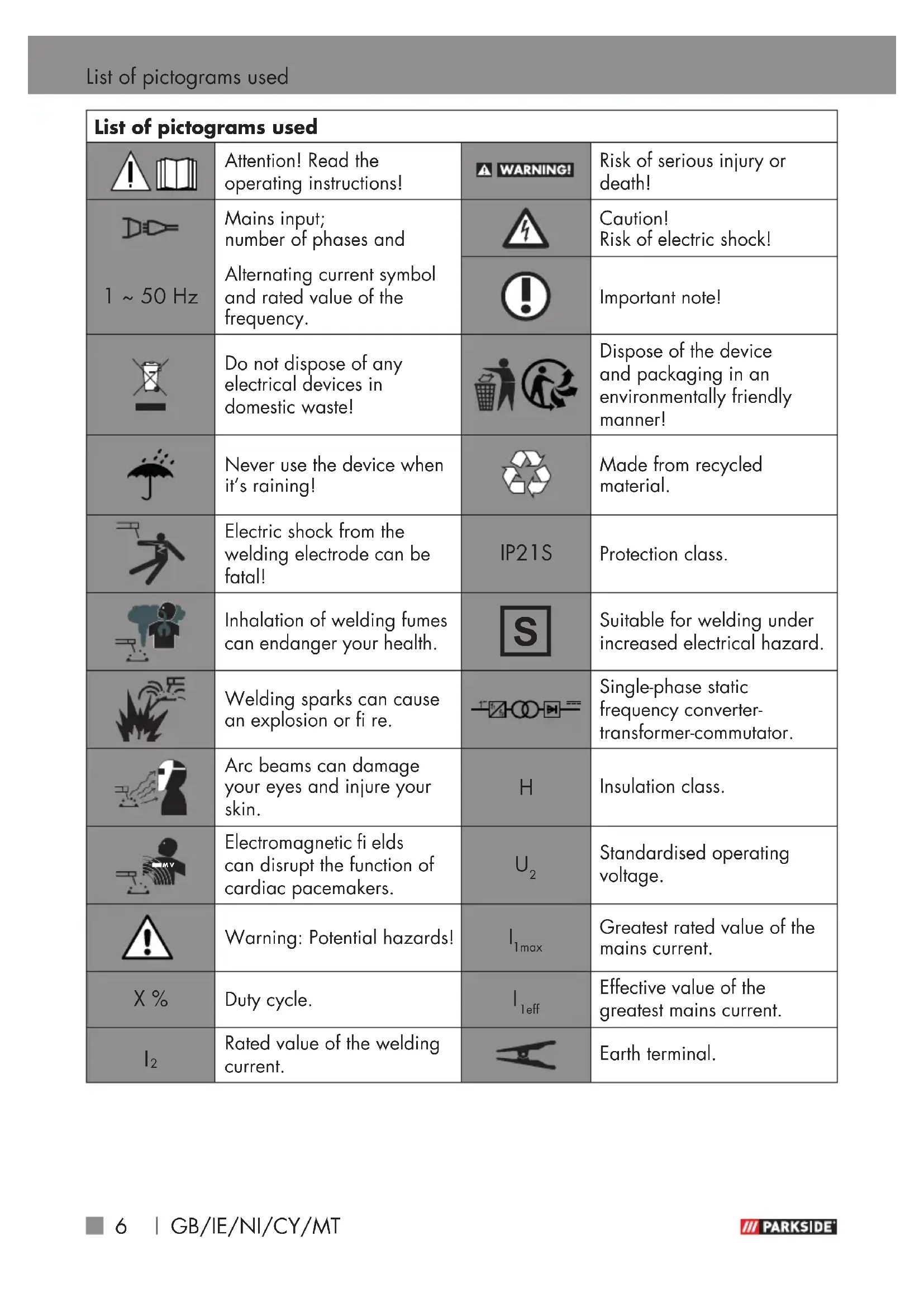 Rated value of the welding current. Earth terminal.7GB/IE/NI/CY/MT List of pictograms used / Introduction List of pictograms used Metal inert and active gas welding including the use of fl ux-cored wire Manual arc welding with encased rod electrodes Tungsten inert gas welding Direct current