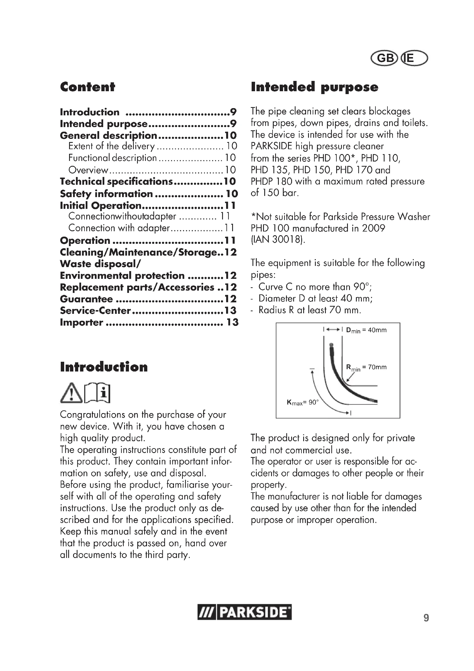 - Not suitable for Parkside Pressure Washer PHD 100 manufactured in 2009 (IAN 30018). The equipment is suitable for the following pipes: - Curve C no more than 90°; - Diameter D at least 40 mm; - Radius R at least 70 mm. min D = 40mm min R = 70mm K = 90° max The product is designed only for private and not commercial use. The operator or user is responsible for ac- cidents or damages to other people or their property. The manufacturer is not liable for damages caused by use other than for the intended purpose or improper operation.10 GB IE General description See the front fold-out page for illustrations. Extent of the delivery Carefully unpack the appliance and check that it is complete: - Pipe cleaning set - Adapter - Instruction Manual Functional description The pipe cleaning set comprises a nozzle head and a 15 m long, exible hose, which can be connected to a pressure washer. The hose is moved through the pipe by the four high-pressure jets that are directed backwards and the blockage is released by the water jet. The adapter is suitable for connecting to other common high pressure cleaners made by other manufacturers. Overview 1 Pipe cleaning set 2 Connecting piece 3 Nozzle head 4 Pipe cleaning hose 5 Red safety marking 6 Marking ring 7 Scale 8 Pressure washer jet gun (sold separately) 9 Adapter 10 Retainer nut Technical specications PRRS 15 A3 Pipe cleaning set: Max. inlet temperature (T max) p. 60
