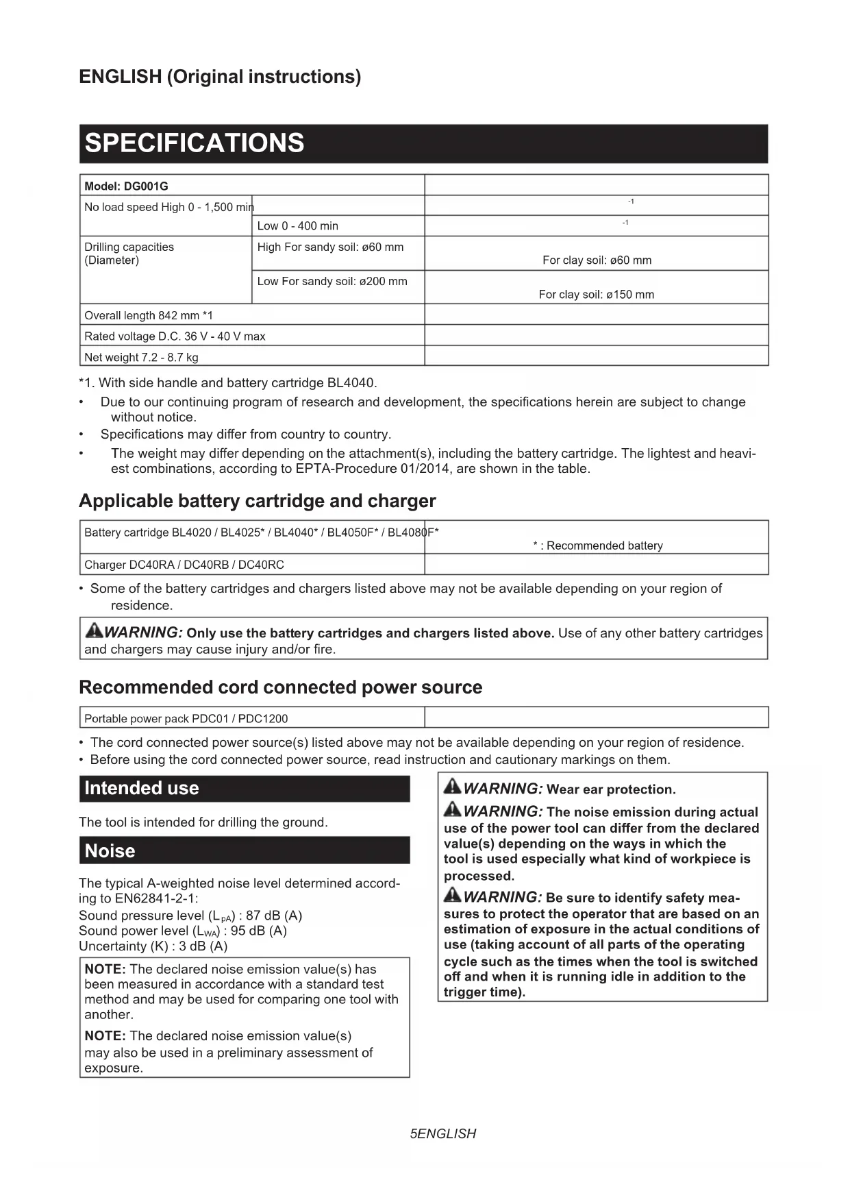 - Before using the cord connected power source, read instruction and cautionary markings on them. Intended use The tool is intended for drilling the ground. Noise The typical A-weighted noise level determined accord- ing to EN62841-2-1: Sound pressure level (L