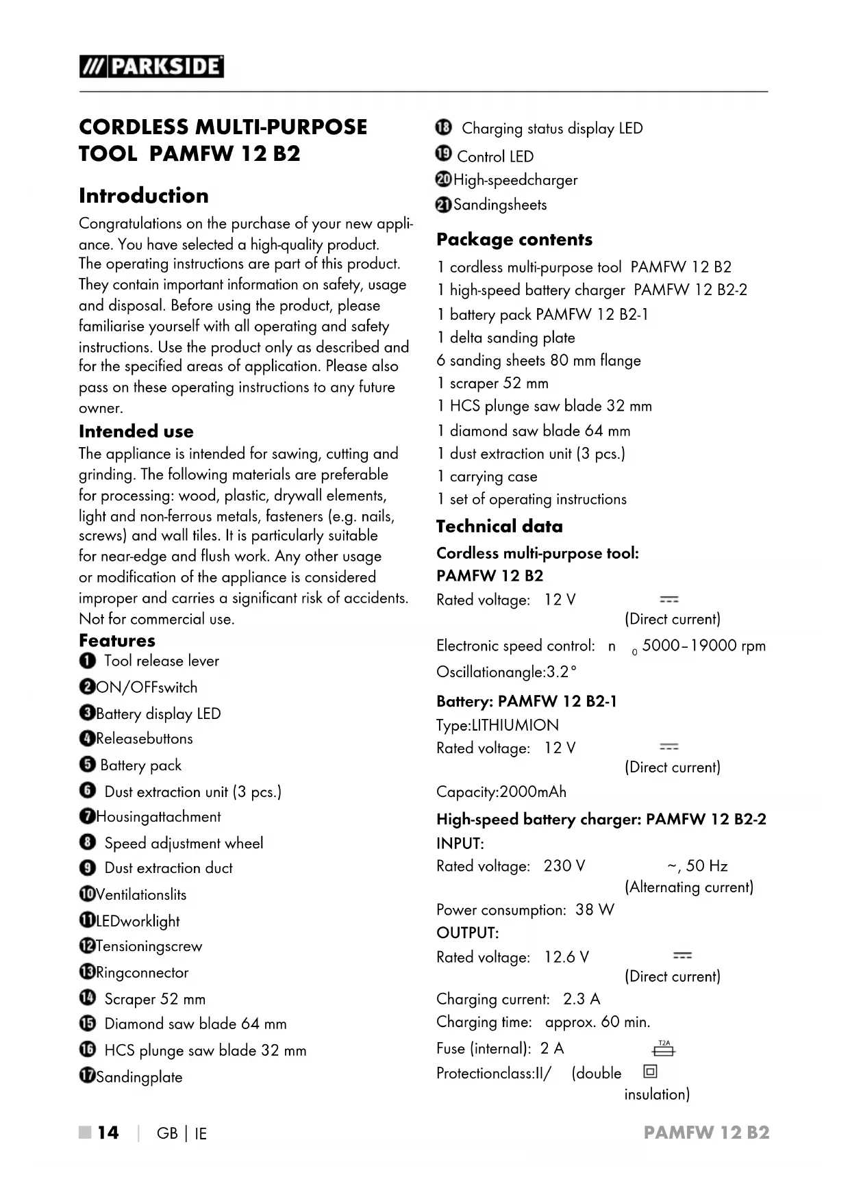 Introduction Congratulations on the purchase of your new appli- ance. You have selected a high-quality product. The operating instructions are part of this product. They contain important information on safety, usage and disposal. Before using the product, please familiarise yourself with all operating and safety instructions. Use the product only as described and for the specified areas of application. Please also pass on these operating instructions to any future owner. Intended use The appliance is intended for sawing, cutting and grinding. The following materials are preferable for processing: wood, plastic, drywall elements, light and non-ferrous metals, fasteners (e.g. nails, screws) and wall tiles. It is particularly suitable for near-edge and flush work. Any other usage or modification of the appliance is considered improper and carries a significant risk of accidents. Not for commercial use. Features Tool release lever ON/OFF switch Battery display LED Release buttons Battery pack Dust extraction unit (3 pcs.) Housing attachment Speed adjustment wheel Dust extraction duct Ventilation slits LED work light Tensioning screw Ring connector Scraper 52 mm Diamond saw blade 64 mm HCS plunge saw blade 32 mm Sanding plate Charging status display LED Control LED High-speed charger Sanding sheets Package contents 1 cordless multi-purpose tool PAMFW 12 B2 1 high-speed battery charger PAMFW 12 B2-2 1 battery pack PAMFW 12 B2-1 1 delta sanding plate 6 sanding sheets 80 mm flange 1 scraper 52 mm 1 HCS plunge saw blade 32 mm 1 diamond saw blade 64 mm 1 dust extraction unit (3 pcs.) 1 carrying case 1 set of operating instructions Technical data Cordless multi-purpose tool: PAMFW 12 B2 Rated voltage: 12 V (Direct current) Electronic speed control: n