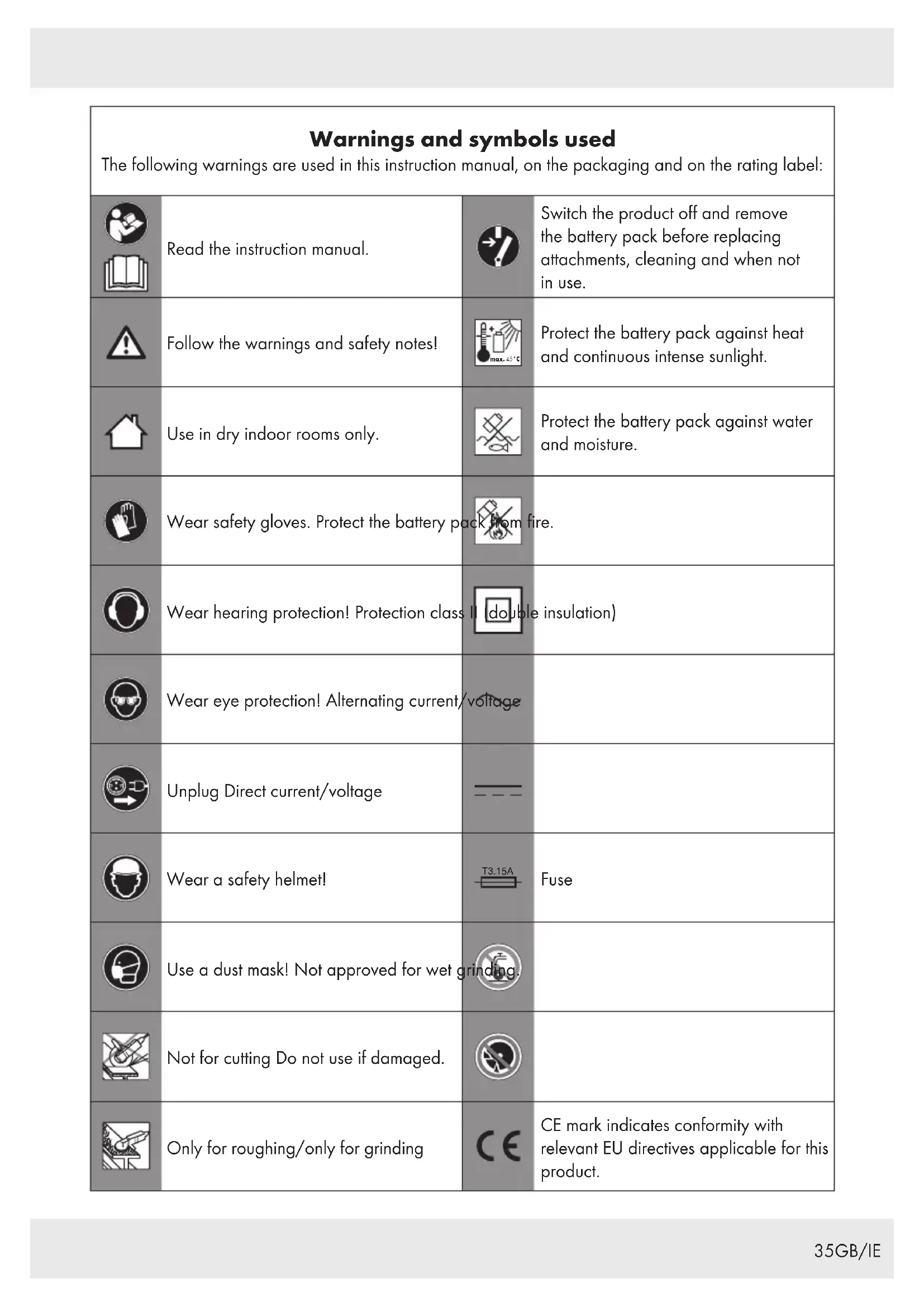 Introduction We congratulate you on the purchase of your new product. You have chosen a high quality product. The instructions for use are part of the product. They contain important information concerning safety, use and disposal. Before using the product, please familiarise yourself with all of the safety information and instructions for use. Only use the product as described and for the specified applications. If you pass the product on to anyone else, please ensure that you also pass on all the documentation with it. Intended use This cordless angle grinder (hereinafter “product” or “power tool”) is designed for the following tasks: Abrasive cutting-off Grinding metal/concrete/tiles without the use of water Wire brushing metal The product is not intended for any other types of applications (e.g. grinding with unsuitable grinding tools, grinding with a coolant solution, grinding or cutting hazardous materials such as asbestos). The product is not intended for sanding and polishing.
