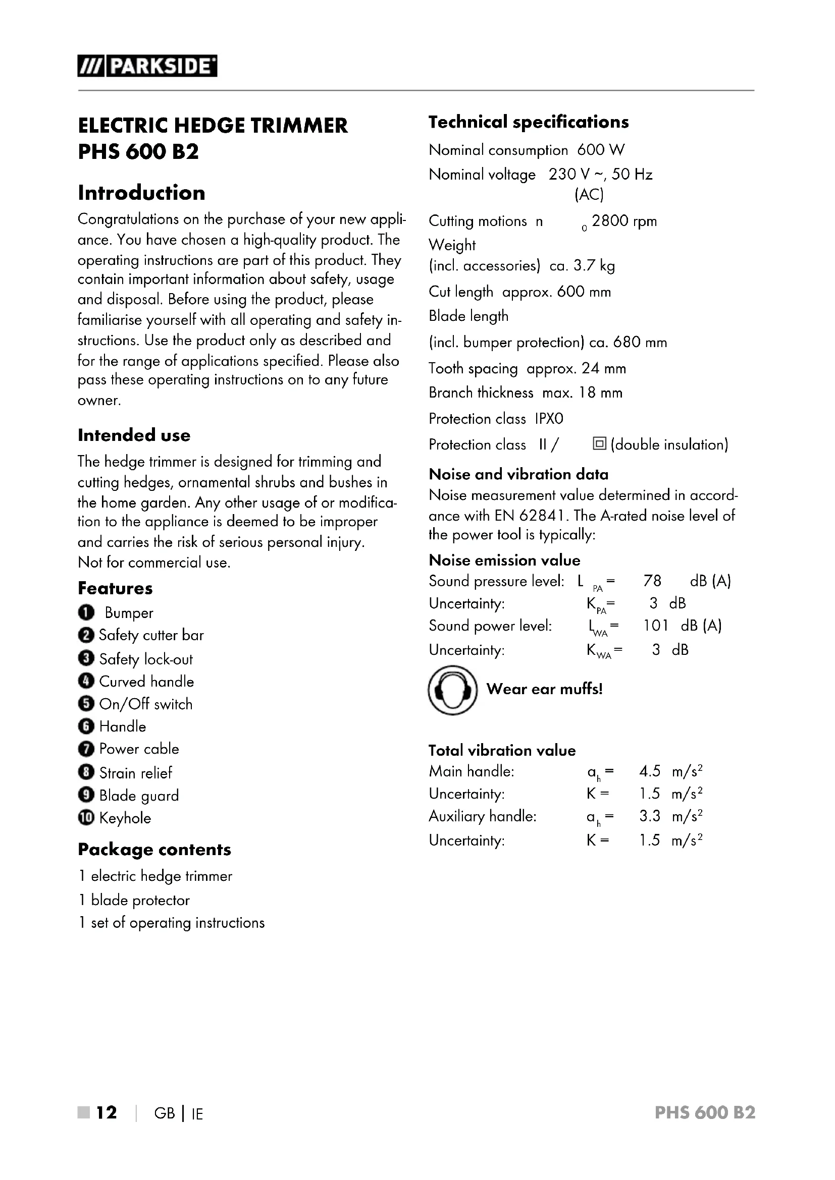 PHS 600 B2 Introduction Congratulations on the purchase of your new appli- ance. You have chosen a high-quality product. The operating instructions are part of this product. They contain important information about safety, usage and disposal. Before using the product, please familiarise yourself with all operating and safety in- structions. Use the product only as described and for the range of applications specified. Please also pass these operating instructions on to any future owner. Intended use The hedge trimmer is designed for trimming and cutting hedges, ornamental shrubs and bushes in the home garden. Any other usage of or modifica- tion to the appliance is deemed to be improper and carries the risk of serious personal injury. Not for commercial use. Features Bumper Safety cutter bar Safety lock-out Curved handle On/Off switch Handle Power cable Strain relief Blade guard Keyhole Package contents 1 electric hedge trimmer 1 blade protector 1 set of operating instructions Technical specifications Nominal consumption 600W Nominal voltage 230 V ∼, 50 Hz (AC) Cutting motions n