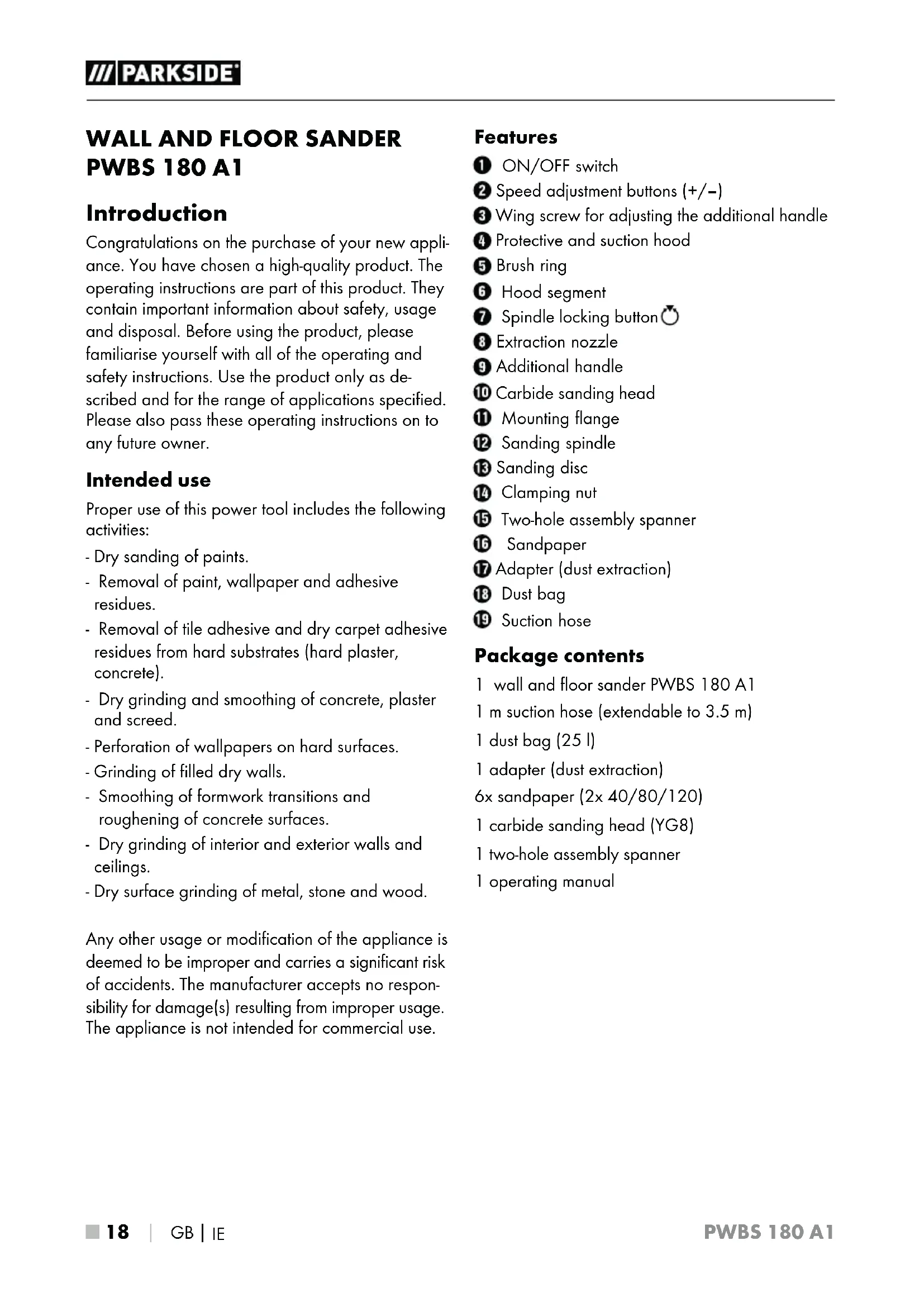 PWBS 180 A1 Introduction Congratulations on the purchase of your new appli- ance. You have chosen a high-quality product. The operating instructions are part of this product. They contain important information about safety, usage and disposal. Before using the product, please familiarise yourself with all of the operating and safety instructions. Use the product only as de- scribed and for the range of applications specified. Please also pass these operating instructions on to any future owner. Intended use Proper use of this power tool includes the following activities: - Dry sanding of paints. - Removal of paint, wallpaper and adhesive residues. - Removal of tile adhesive and dry carpet adhesive residues from hard substrates (hard plaster, concrete). - Dry grinding and smoothing of concrete, plaster and screed. - Perforation of wallpapers on hard surfaces. - Grinding of filled dry walls. - Smoothing of formwork transitions and roughening of concrete surfaces. - Dry grinding of interior and exterior walls and ceilings. - Dry surface grinding of metal, stone and wood. Any other usage or modification of the appliance is deemed to be improper and carries a significant risk of accidents. The manufacturer accepts no respon- sibility for damage(s) resulting from improper usage. The appliance is not intended for commercial use. Features ON/OFF switch Speed adjustment buttons (+/–) Wing screw for adjusting the additional handle Protective and suction hood Brush ring Hood segment Spindle locking button Extraction nozzle Additional handle Carbide sanding head Mounting flange Sanding spindle Sanding disc Clamping nut Two-hole assembly spanner Sandpaper Adapter (dust extraction) Dust bag Suction hose Package contents 1 wall and floor sander PWBS 180 A1 1m suction hose (extendable to 3.5m) 1 dust bag (25 l) 1 adapter (dust extraction) 6x sandpaper (2x 40/80/120) 1 carbide sanding head (YG8) 1 two-hole assembly spanner 1 operating manualPWBS 180 A1