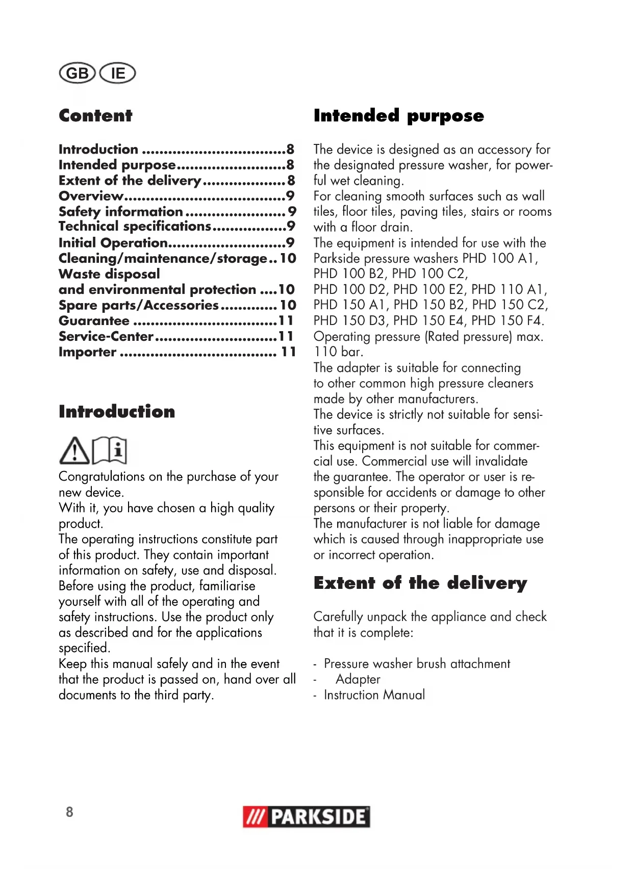 - Importer Introduction Congratulations on the purchase of your new device. With it, you have chosen a high quality product. The operating instructions constitute part of this product. They contain important information on safety, use and disposal. Before using the product, familiarise yourself with all of the operating and safety instructions. Use the product only as described and for the applications specied. Keep this manual safely and in the event that the product is passed on, hand over all documents to the third party. Intended purpose The device is designed as an accessory for the designated pressure washer, for power- ful wet cleaning. For cleaning smooth surfaces such as wall tiles, oor tiles, paving tiles, stairs or rooms with a oor drain. The equipment is intended for use with the Parkside pressure washers PHD100A1, PHD100B2, PHD100C2, PHD100D2, PHD 100 E2, PHD 110 A1, PHD150A1, PHD150B2, PHD 150 C2, PHD 150 D3, PHD 150 E4, PHD 150 F4. Operating pressure (Rated pressure) max. 110 bar. The adapter is suitable for connecting to other common high pressure cleaners made by other manufacturers. The device is strictly not suitable for sensi- tive surfaces. This equipment is not suitable for commer- cial use. Commercial use will invalidate the guarantee. The operator or user is re- sponsible for accidents or damage to other persons or their property. The manufacturer is not liable for damage which is caused through inappropriate use or incorrect operation. Extent of the delivery Carefully unpack the appliance and check that it is complete: - Pressure washer brush attachment - Adapter - Instruction Manual9 p. 11