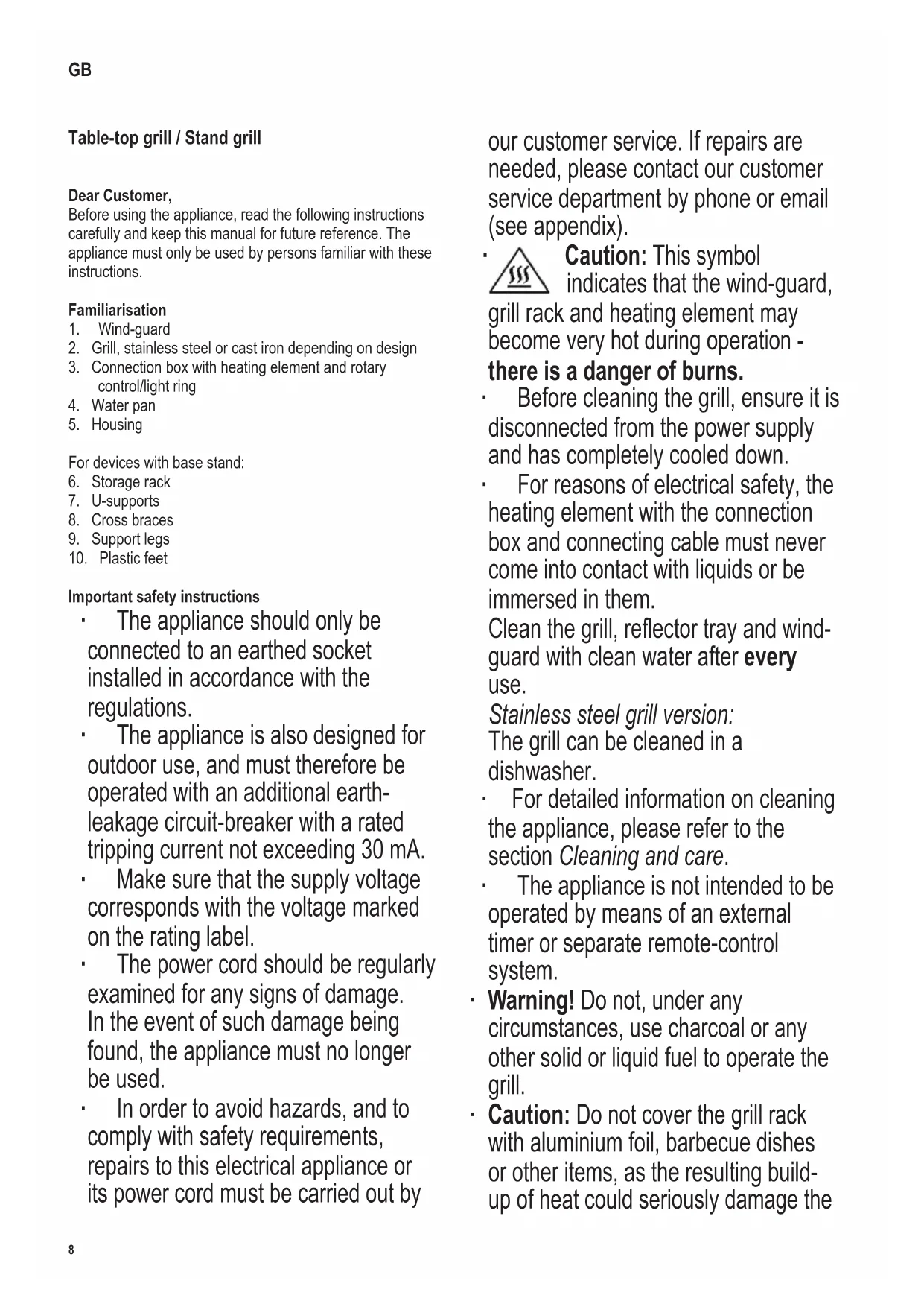 Caution: This symbol indicates that the wind-guard, grill rack and heating element may become very hot during operation - there is a danger of burns. ∙ Before cleaning the grill, ensure it is disconnected from the power supply and has completely cooled down. ∙ For reasons of electrical safety, the heating element with the connection box and connecting cable must never come into contact with liquids or be immersed in them. Clean the grill, reector tray and wind- guard with clean water after every use. Stainless steel grill version: The grill can be cleaned in a dishwasher. ∙ For detailed information on cleaning the appliance, please refer to the section Cleaning and care. ∙ The appliance is not intended to be operated by means of an external timer or separate remote-control system. ∙ Warning! Do not, under any circumstances, use charcoal or any other solid or liquid fuel to operate the grill. ∙ Caution: Do not cover the grill rack with aluminium foil, barbecue dishes or other items, as the resulting build- up of heat could seriously damage the GB9 142 x 208 mm grill. ∙ A maximum of 1.1 litres of water may be poured into the reector tray. ∙ This appliance is intended for domestic or similar applications, such