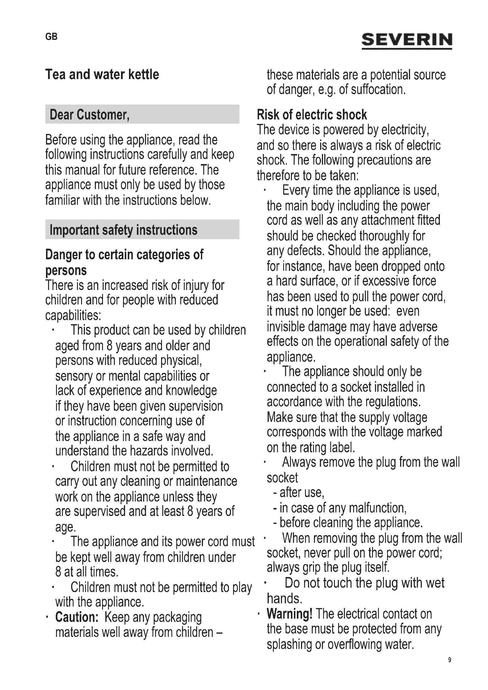 Download the instructions for your Tea maker in PDF format for free! Find your manual WK 3454 - SEVERIN and take your electronic device back in hand. On this page are published all the documents necessary for the use of your device. WK 3454 by SEVERIN.