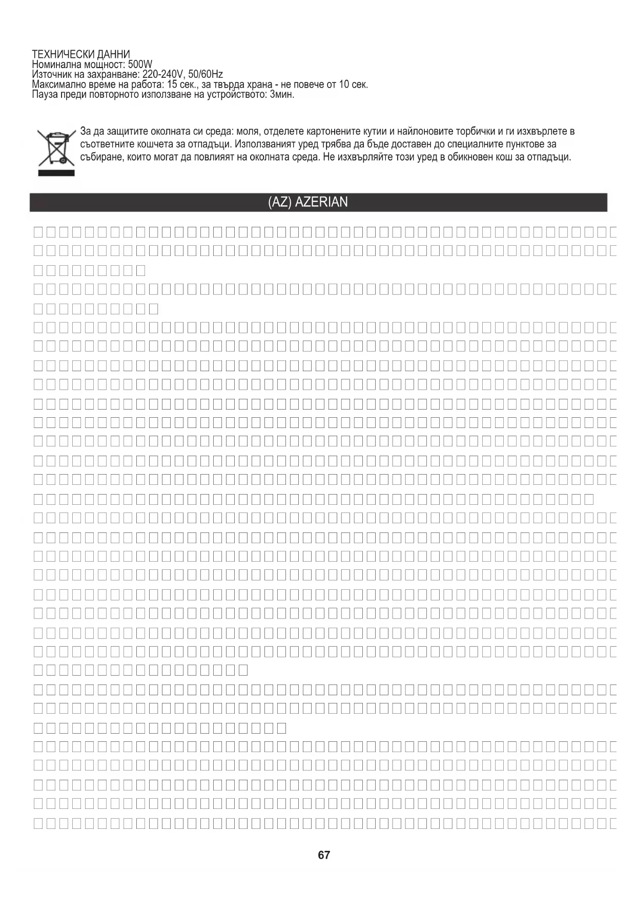 4. After use release the speed button and remove whisk attachment from the motor part (1c). Unplug the device from a power socket. 2.Attach the motor part (1c) to the assembled whisk. During processing, hold the blender with one hand and the beaker (4) with the other hand. To avoid spreading always mix more liquid contents in the beaker (4). Never put motor part (1c) into water and keep away from wet. Before cleaning always switch off device and unplug from the power socket. 3.Do not clean with any abrasive scouring pad or steel wool, as this will damage the finish of the appliance. Time break before the re-use of device: 3min TECHNICAL DATA Nominal power: 500W Voltage:220-240V, 50/60Hz Max operating time: 15s, hard food- no longer than 10s its reuse and use. If in the device there are batteries you have to take out and give to the point stored separately. ingredients may pose a threat to the environment. The electrical device should be handed over to limit Worn device should be returned to the appropriate point storage because it is dangerous in the device Please transfer cardboard packaging to waste paper. Pour the polyethylene bags (PE) into the plastic container (DE) DEUTSCH