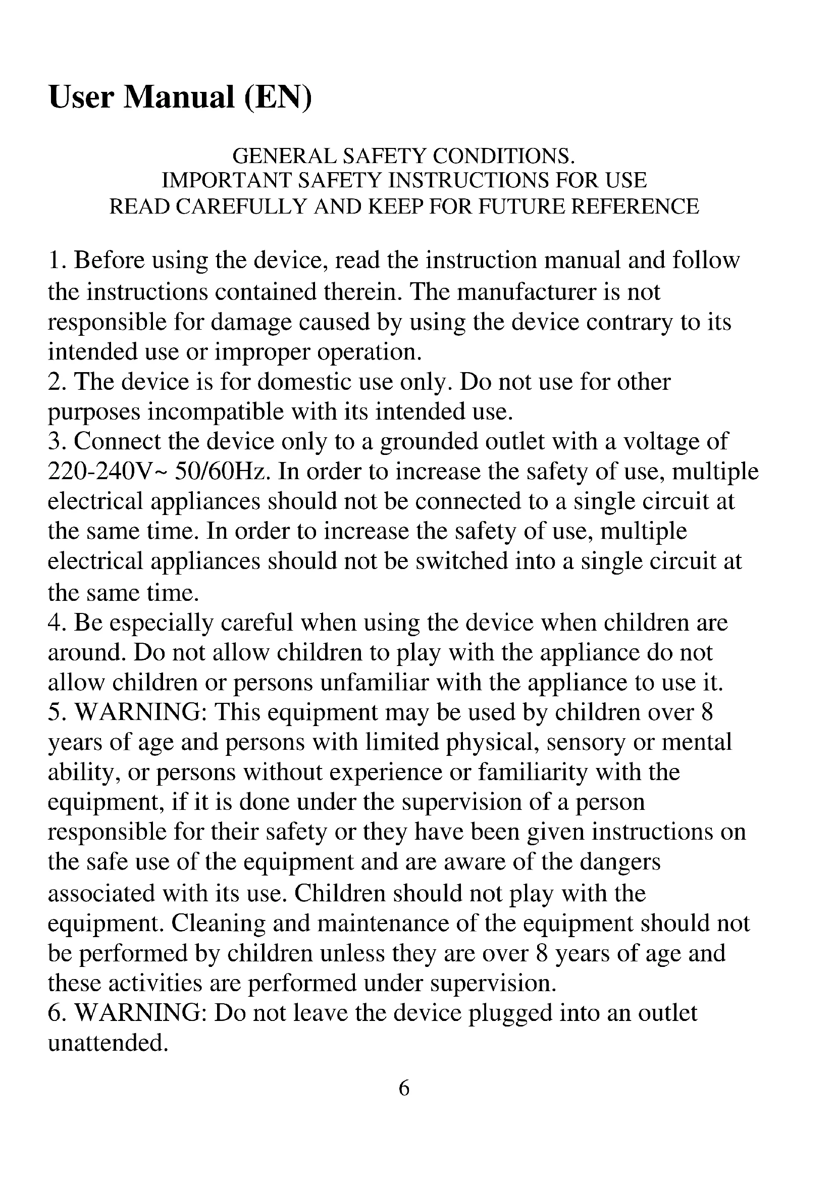 2. The device is for domestic use only. Do not use for other