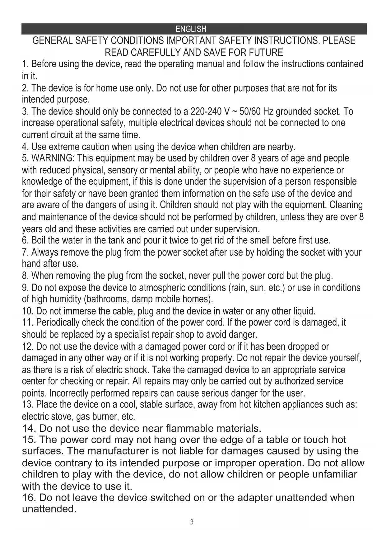 3. The device should only be connected to a 220-240 V ~ 50/60 Hz grounded socket. To