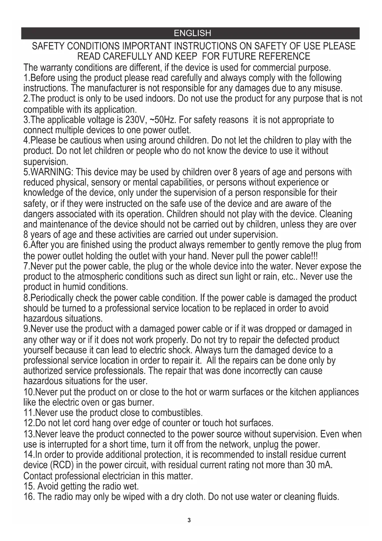 7.Never put the power cable, the plug or the whole device into the water. Never expose the product to the atmospheric conditions such as direct sun light or rain, etc.. Never use the product in humid conditions.