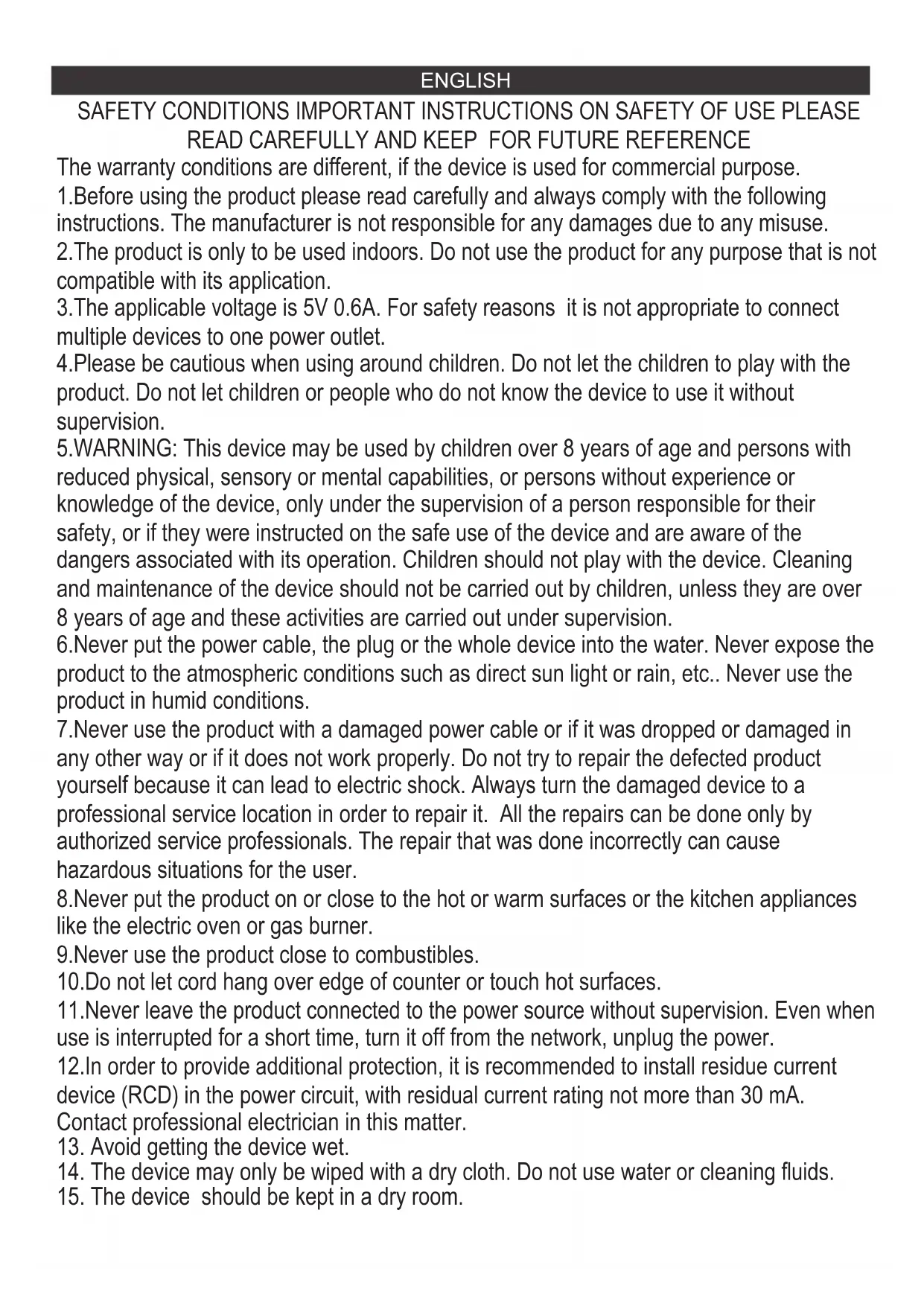 7ENGLISH SAFETY CONDITIONS IMPORTANT INSTRUCTIONS ON SAFETY OF USE PLEASE READ CAREFULLY AND KEEP FOR FUTURE REFERENCE The warranty conditions are different, if the device is used for commercial purpose. 1.Before using the product please read carefully and always comply with the following instructions. The manufacturer is not responsible for any damages due to any misuse. 2.The product is only to be used indoors. Do not use the product for any purpose that is not compatible with its application. 3.The applicable voltage is 5V 0.6A. For safety reasons it is not appropriate to connect multiple devices to one power outlet. 4.Please be cautious when using around children. Do not let the children to play with the product. Do not let children or people who do not know the device to use it without supervision. 5.WARNING: This device may be used by children over 8 years of age and persons with reduced physical, sensory or mental capabilities, or persons without experience or knowledge of the device, only under the supervision of a person responsible for their safety, or if they were instructed on the safe use of the device and are aware of the dangers associated with its operation. Children should not play with the device. Cleaning and maintenance of the device should not be carried out by children, unless they are over 8 years of age and these activities are carried out under supervision. 6.Never put the power cable, the plug or the whole device into the water. Never expose the product to the atmospheric conditions such as direct sun light or rain, etc.. Never use the product in humid conditions. 7.Never use the product with a damaged power cable or if it was dropped or damaged in any other way or if it does not work properly. Do not try to repair the defected product yourself because it can lead to electric shock. Always turn the damaged device to a professional service location in order to repair it. All the repairs can be done only by authorized service professionals. The repair that was done incorrectly can cause hazardous situations for the user. 8.Never put the product on or close to the hot or warm surfaces or the kitchen appliances like the electric oven or gas burner. 9.Never use the product close to combustibles. 10.Do not let cord hang over edge of counter or touch hot surfaces. 11.Never leave the product connected to the power source without supervision. Even when use is interrupted for a short time, turn it off from the network, unplug the power. 12.In order to provide additional protection, it is recommended to install residue current device (RCD) in the power circuit, with residual current rating not more than 30 mA. Contact professional electrician in this matter.