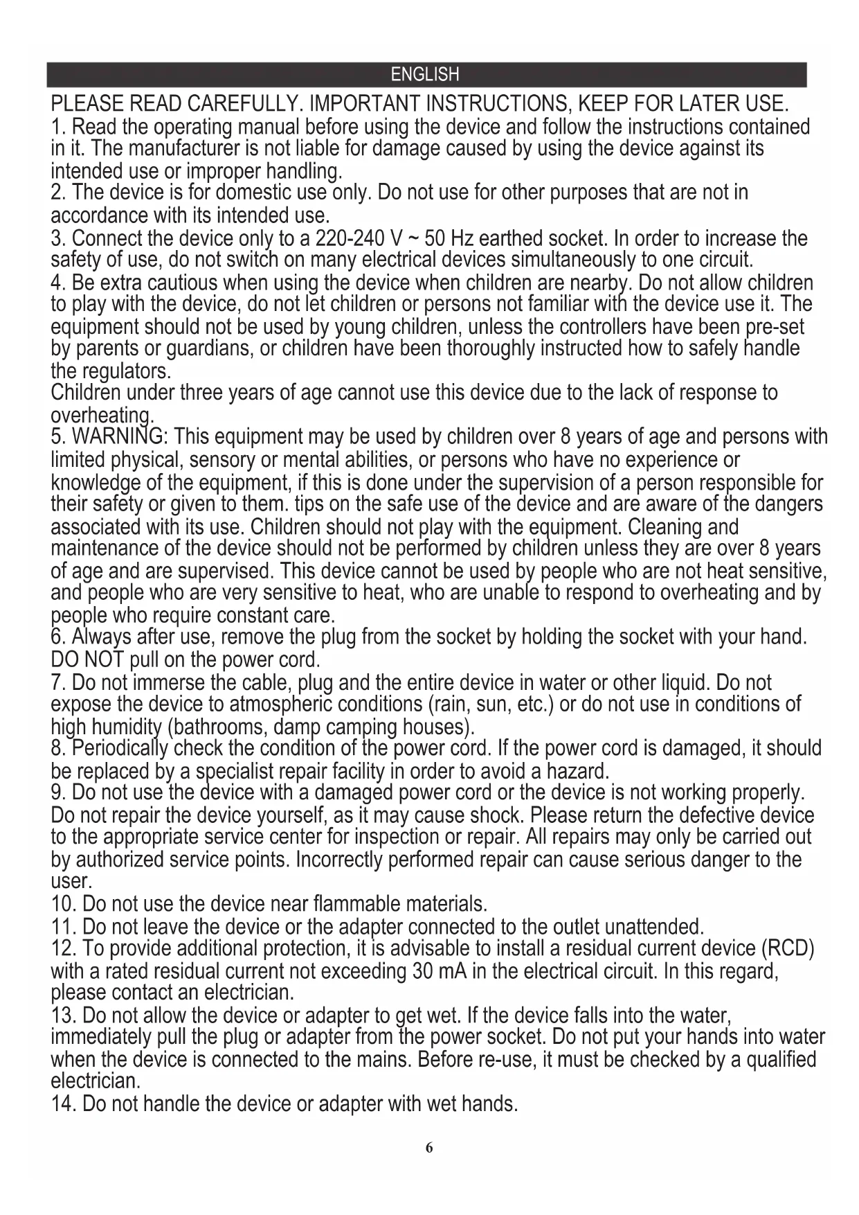 limited physical, sensory or mental abilities, or persons who have no experience or knowledge of the equipment, if this is done under the supervision of a person responsible for their safety or given to them. tips on the safe use of the device and are aware of the dangers associated with its use. Children should not play with the equipment. Cleaning and maintenance of the device should not be performed by children unless they are over 8 years of age and are supervised. This device cannot be used by people who are not heat sensitive, and people who are very sensitive to heat, who are unable to respond to overheating and by people who require constant care.