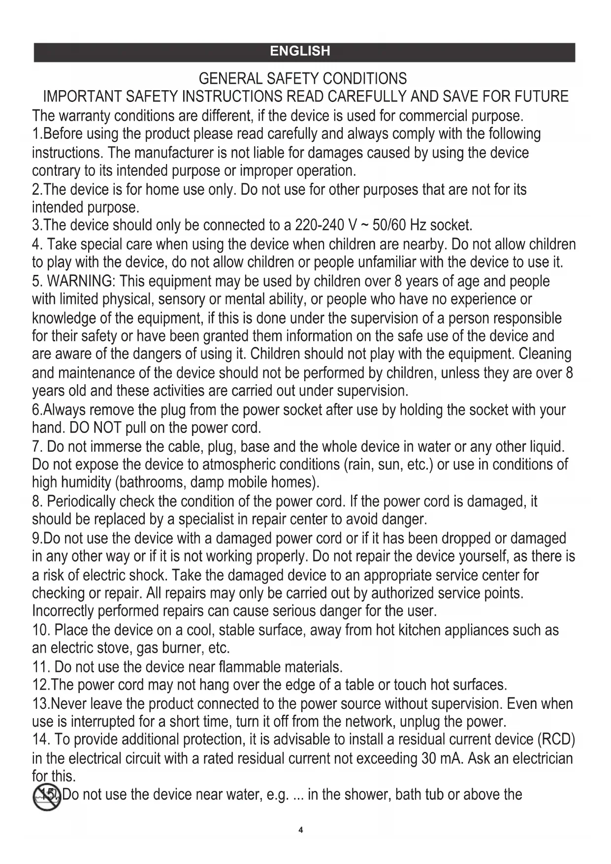 IMPORTANT SAFETY INSTRUCTIONS READ CAREFULLY AND SAVE FOR FUTURE The warranty conditions are different, if the device is used for commercial purpose. 1.Before using the product please read carefully and always comply with the following instructions. The manufacturer is not liable for damages caused by using the device contrary to its intended purpose or improper operation. 2.The device is for home use only. Do not use for other purposes that are not for its intended purpose. 3.The device should only be connected to a 220-240 V ~ 50/60 Hz socket.