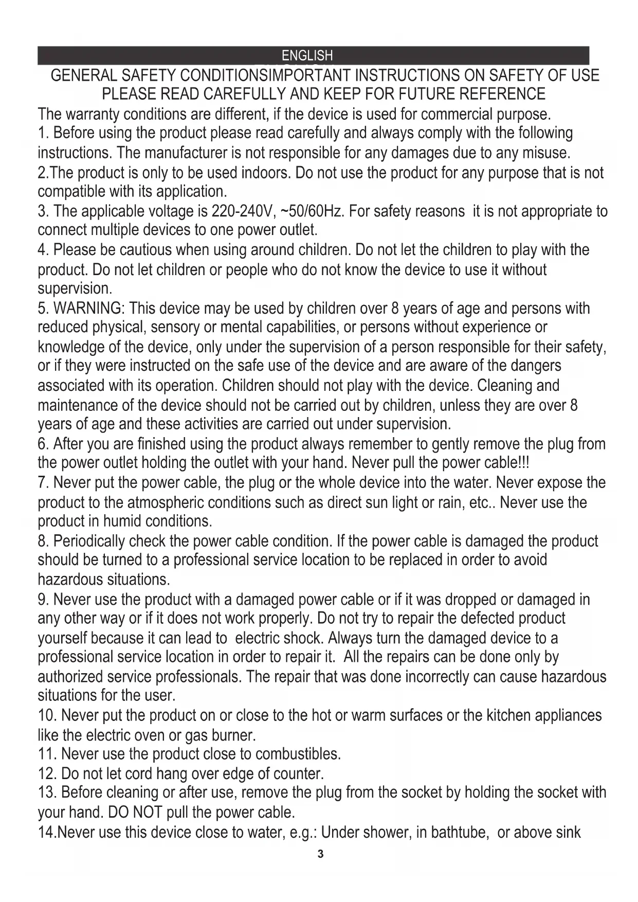 product. Do not let children or people who do not know the device to use it without supervision. GENERAL SAFETY CONDITIONSIMPORTANT INSTRUCTIONS ON SAFETY OF USE PLEASE READ CAREFULLY AND KEEP FOR FUTURE REFERENCE 14.Never use this device close to water, e.g.: Under shower, in bathtube, or above sink