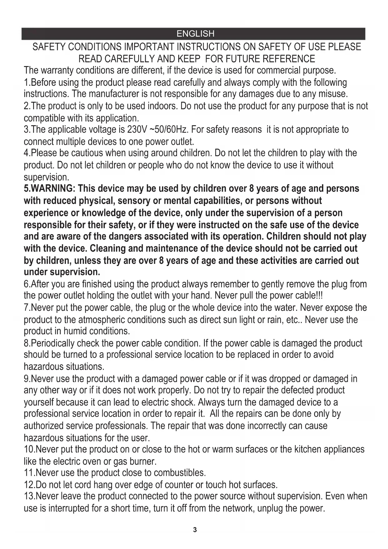ENGLISH 8.Periodically check the power cable condition. If the power cable is damaged the product should be turned to a professional service location to be replaced in order to avoid hazardous situations. 4.Please be cautious when using around children. Do not let the children to play with the product. Do not let children or people who do not know the device to use it without supervision. 2.The product is only to be used indoors. Do not use the product for any purpose that is not compatible with its application. 3.The applicable voltage is 230V ~50/60Hz. For safety reasons it is not appropriate to connect multiple devices to one power outlet. 13.Never leave the product connected to the power source without supervision. Even when use is interrupted for a short time, turn it off from the network, unplug the power. 5.WARNING: This device may be used by children over 8 years of age and persons with reduced physical, sensory or mental capabilities, or persons without experience or knowledge of the device, only under the supervision of a person responsible for their safety, or if they were instructed on the safe use of the device and are aware of the dangers associated with its operation. Children should not play with the device. Cleaning and maintenance of the device should not be carried out by children, unless they are over 8 years of age and these activities are carried out under supervision. 9.Never use the product with a damaged power cable or if it was dropped or damaged in any other way or if it does not work properly. Do not try to repair the defected product yourself because it can lead to electric shock. Always turn the damaged device to a professional service location in order to repair it. All the repairs can be done only by authorized service professionals. The repair that was done incorrectly can cause hazardous situations for the user. 11.Never use the product close to combustibles. SAFETY CONDITIONS IMPORTANT INSTRUCTIONS ON SAFETY OF USE PLEASE READ CAREFULLY AND KEEP FOR FUTURE REFERENCE The warranty conditions are different, if the device is used for commercial purpose. 1.Before using the product please read carefully and always comply with the following instructions. The manufacturer is not responsible for any damages due to any misuse. 6.After you are finished using the product always remember to gently remove the plug from the power outlet holding the outlet with your hand. Never pull the power cable!!! 10.Never put the product on or close to the hot or warm surfaces or the kitchen appliances like the electric oven or gas burner. 7.Never put the power cable, the plug or the whole device into the water. Never expose the product to the atmospheric conditions such as direct sun light or rain, etc.. Never use the product in humid conditions. 12.Do not let cord hang over edge of counter or touch hot surfaces.4