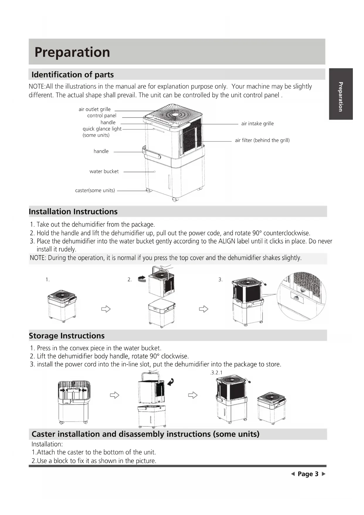 ,IZDWHUHQWHUVWKHXQLWWXUQWKHXQLWRIIDQGGLVFRQQHFWWKHSRZHUFRQWDFWDTXDOLILHGVHUYLFH WHFKQLFLDQ 'RQRWSODFHIORZHUYDVHVRURWKHUZDWHUFRQWDLQHURQWRSRIWKHXQLW 'RQRWXVHH[WHQVLRQFRUGV This symbol indicates the possibility of personnel injury or loss of life.Safety Precautions Page 2 CAUTIONPreparation Page 3 Identification of parts Storage Instructions Installation Instructions NOTE:All the illustrations in the manual are for explanation purpose only. Your machine may be slightly different. The actual shape shall prevail. The unit can be controlled by the unit control panel . Preparation control panelcaster(some units)handleair outlet grillehandlewater bucketair filter (behind the grill)air intake grille