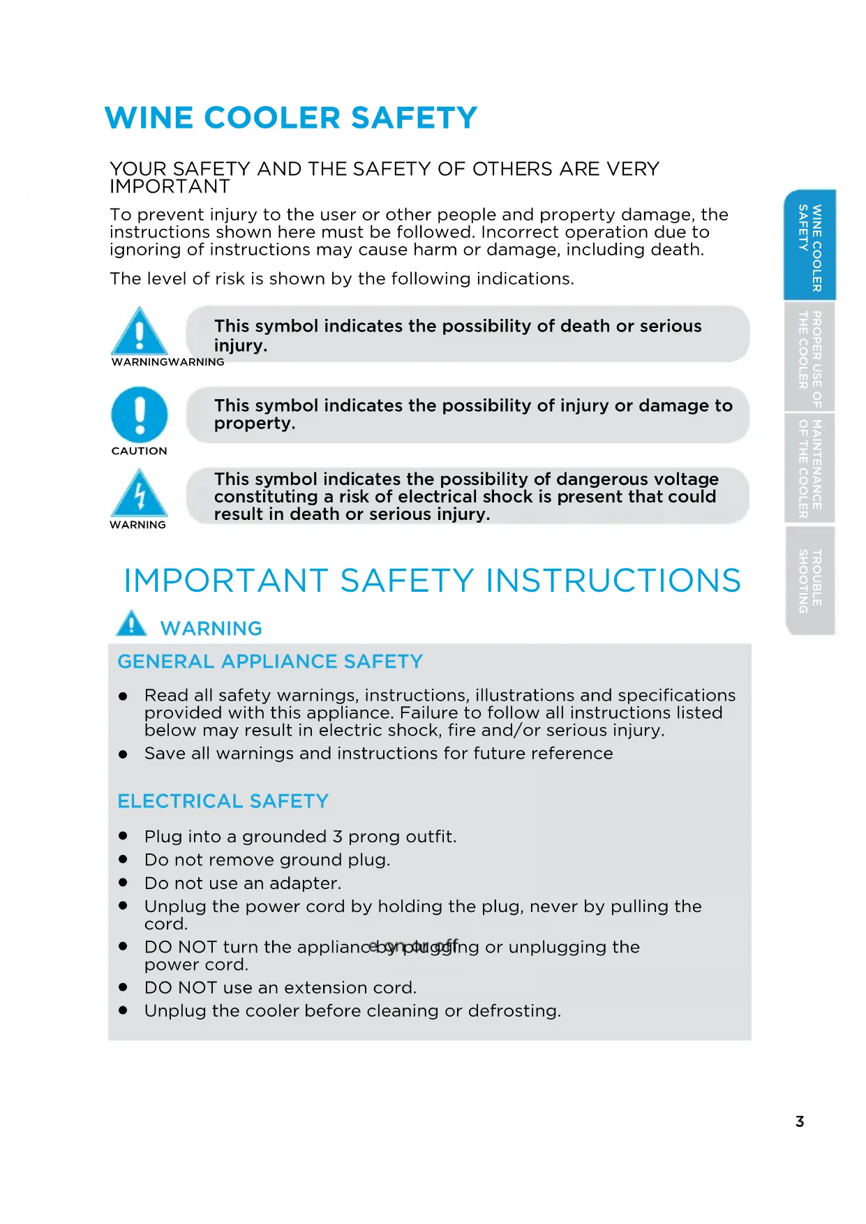 Improper use of the grounding plug can result in a risk of electric shock. Consult a qualified electrician or service person if the grounding instructions are not completely understood or if doubt exists as to whether the cooler is properly grounded. LOCATION SAFETY