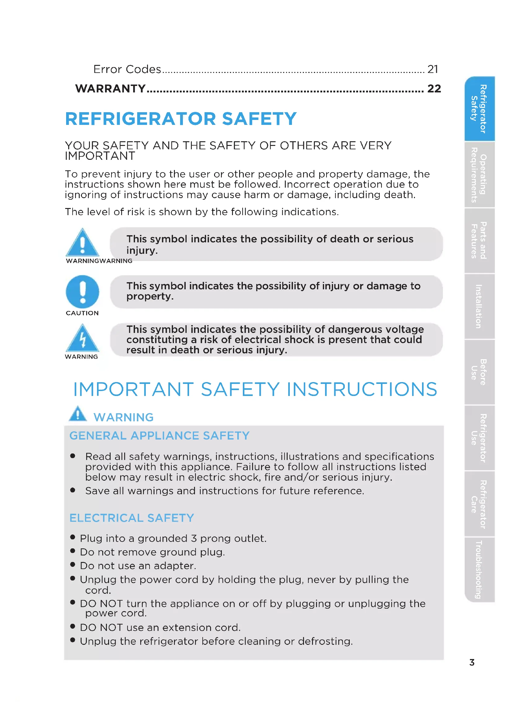 - Unplug the refrigerator before cleaning or defrosting.4 Refrigerator Safety Operating Requirements Parts and Features Installation Refrigerator Use Refrigerator Care Troubleshooting Before Use Grounding requirement