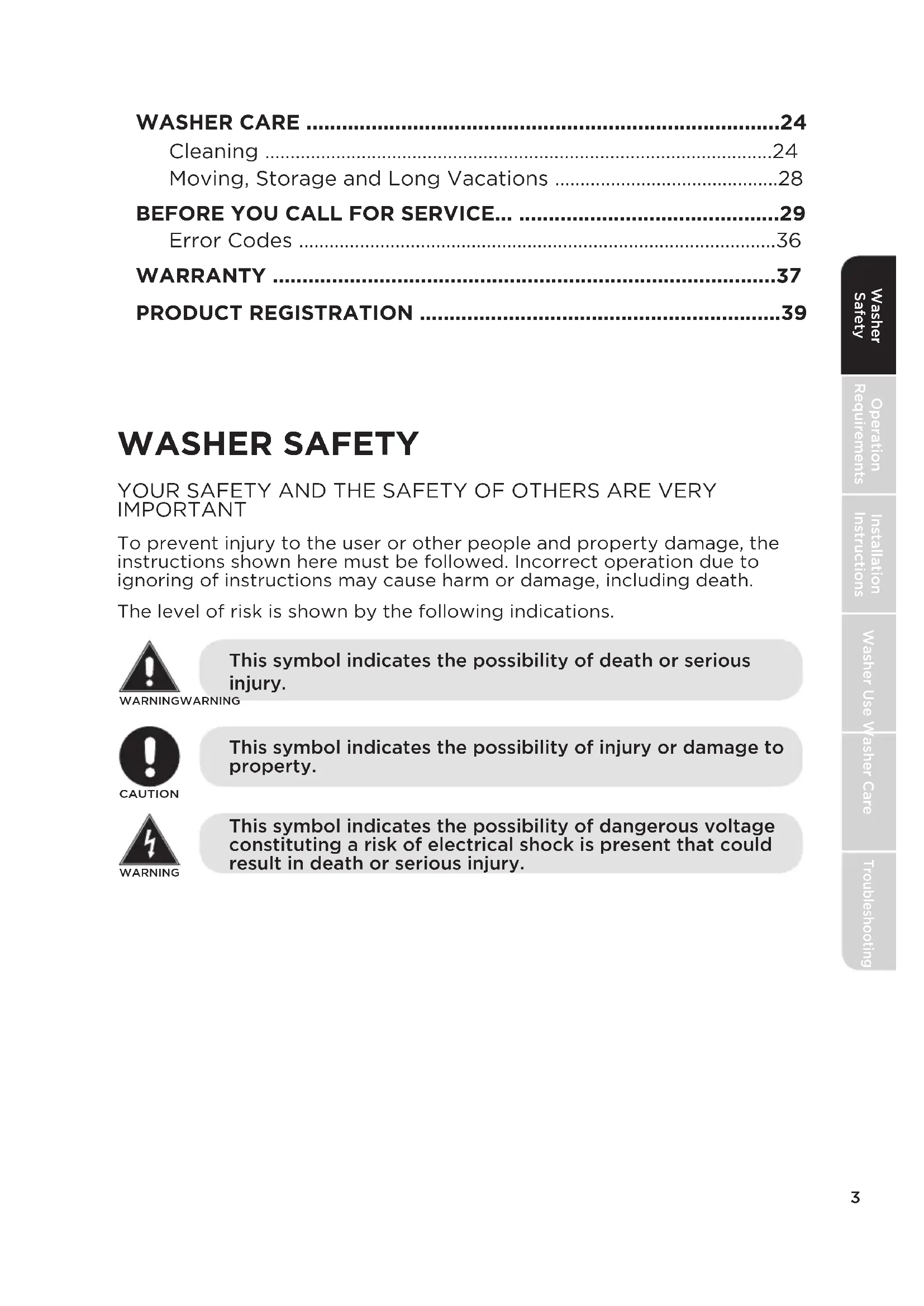 Error Codes ..............................................................................................36 WARRANTY .....................................................................................37 PRODUCT REGISTRATION .............................................................39 WASHER SAFETY YOUR SAFETY AND THE SAFETY OF OTHERS ARE VERY IMPORTANT To prevent injury to the user or other people and property damage, the instructions shown here must be followed. Incorrect operation due to ignoring of instructions may cause harm or damage, including death. The level of risk is shown by the following indications. CAUTIONWARNINGWARNINGWARNING This symbol indicates the possibility of dangerous voltage constituting a risk of electrical shock is present that could result in death or serious injury. This symbol indicates the possibility of injury or damage to property. This symbol indicates the possibility of death or serious injury.4 Washer SafetyOperation RequirementsInstallation InstructionsWasher UseWasher CareTroubleshooting