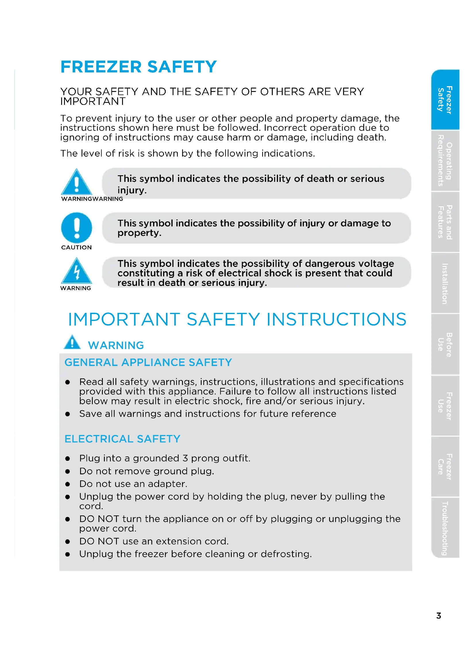 Unplug the freezer before cleaning or defrosting.4 Freezer Safety Operating Requirements Parts and Features Installation Freezer Use Freezer Care Troubleshooting Before Use Grounding requirement