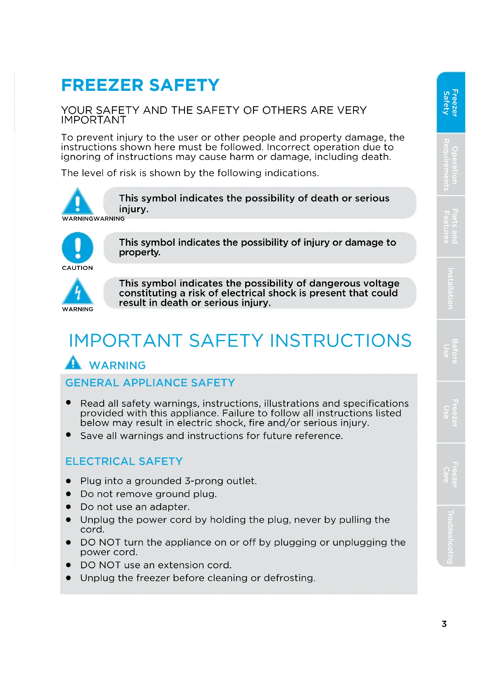Freezer Safety Operati]\ Requirements Parts and Features Installation Freezer Use Freezer Care Troubleshooting Before Use STORAGE IMPORTANT: Do not store freezer in a location that is accessible to children.