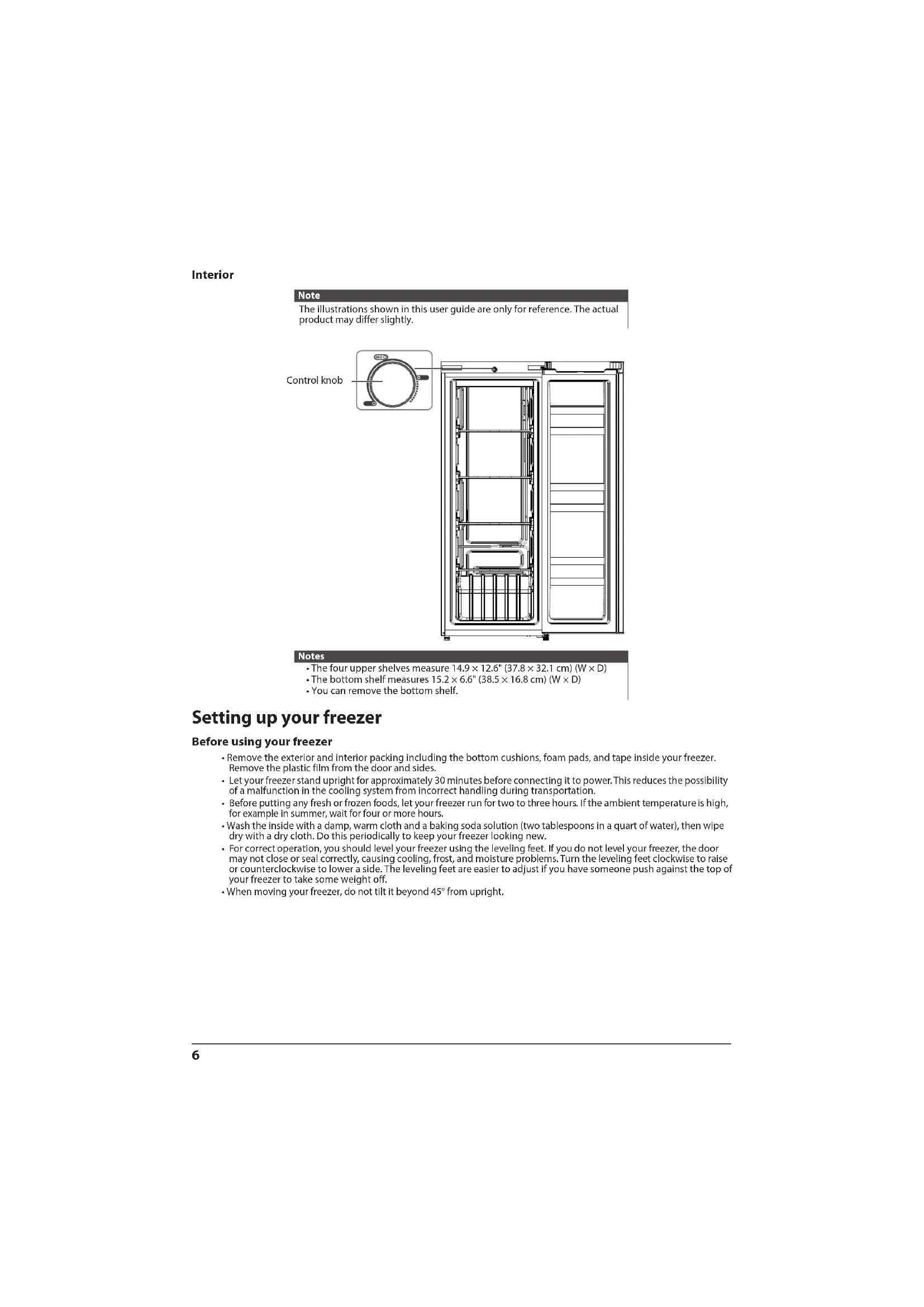 - User Guide Dimensions 21.5" (54.5 cm) 35.9" (91.1 cm) 36.7" (93.1 cm) 19.2" (48.7 cm) 135° 21.7" (55 cm) 55.9" (142 cm) Top of Freezer6 Interior Setting up your freezer Before using your freezer