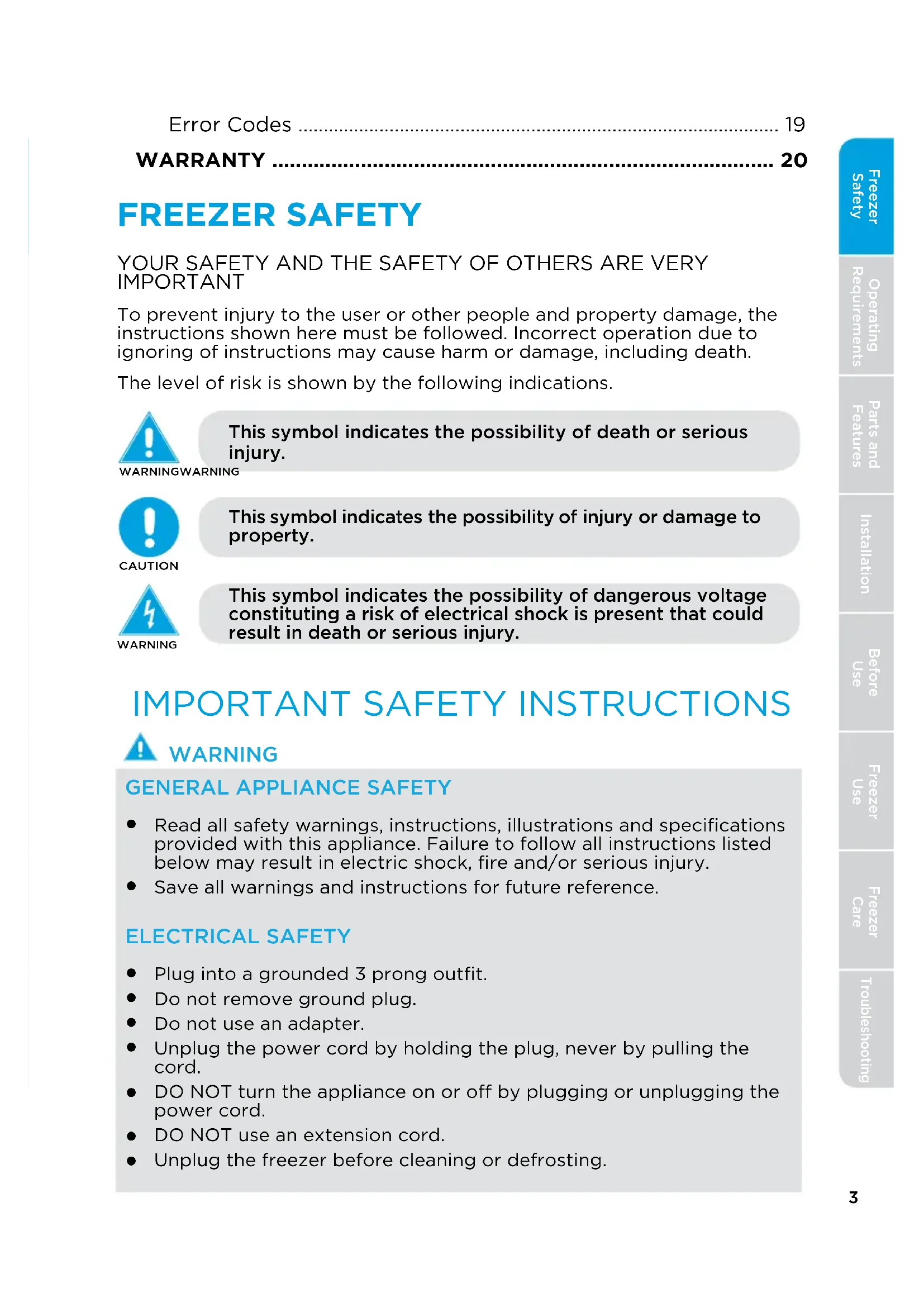 Freezer Safety Operating Requirements Parts and Features Installation Freezer Use Freezer Care Troubleshooting Before Use STORAGE IMPORTANT: Do not store freezer in a location that is accessible to children.