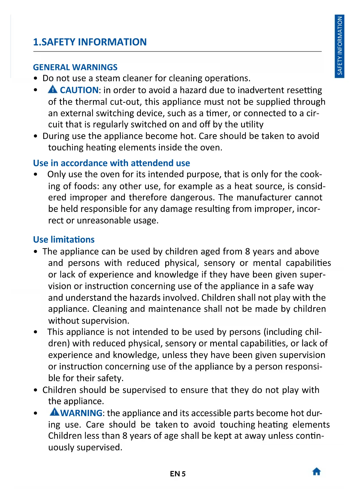 - The appliance is not designed to be acvated by an external mer or separate remote control system. USE & MANTEINANCE
