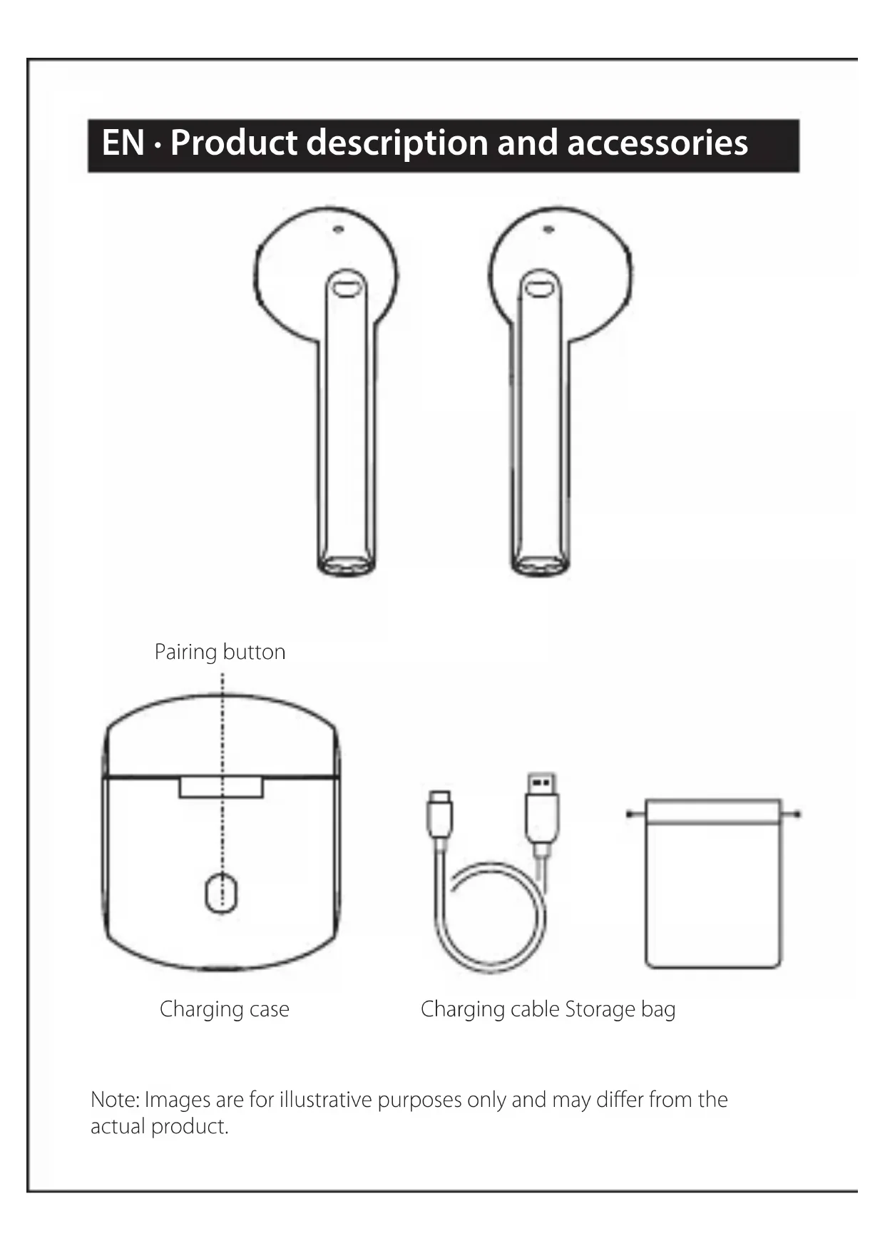 True Wireless Stereo Earbuds TWS200 Plus www.edif ier.comEN · Product description and accessories Charging cable Storage bag Pairing button Note: Images are for illustrative purposes only and may differ from the actual product. Charging case● Charge the earbuds Warning: The rechargeable batteries that provide power for this product must be disposed properly for recycling. Do not dispose of batteries in fire to prevent an explosion. ■ User guide