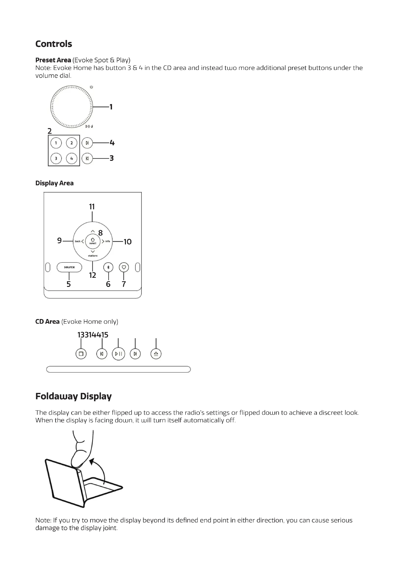 User Guide Evoke Spot Evoke Play Evoke Home Internet Radio . DAB+ . FM . Spotify Connect®. Bluetooth®. CD. Evoke SeriesEnglishControls Preset Area (Evoke Spot & Play) Note: Evoke Home has button 3 & 4 in the CD area and instead two more additional preset buttons under the volume dial. Display Area CD Area (Evoke Home only) Foldaway Display The display can be either flipped up to access the radio’s settings or flipped down to achieve a discreet look. When the display is facing down, it will turn itself automatically off. Note: If you try to move the display beyond its defined end point in either direction, you can cause serious damage to the display joint.