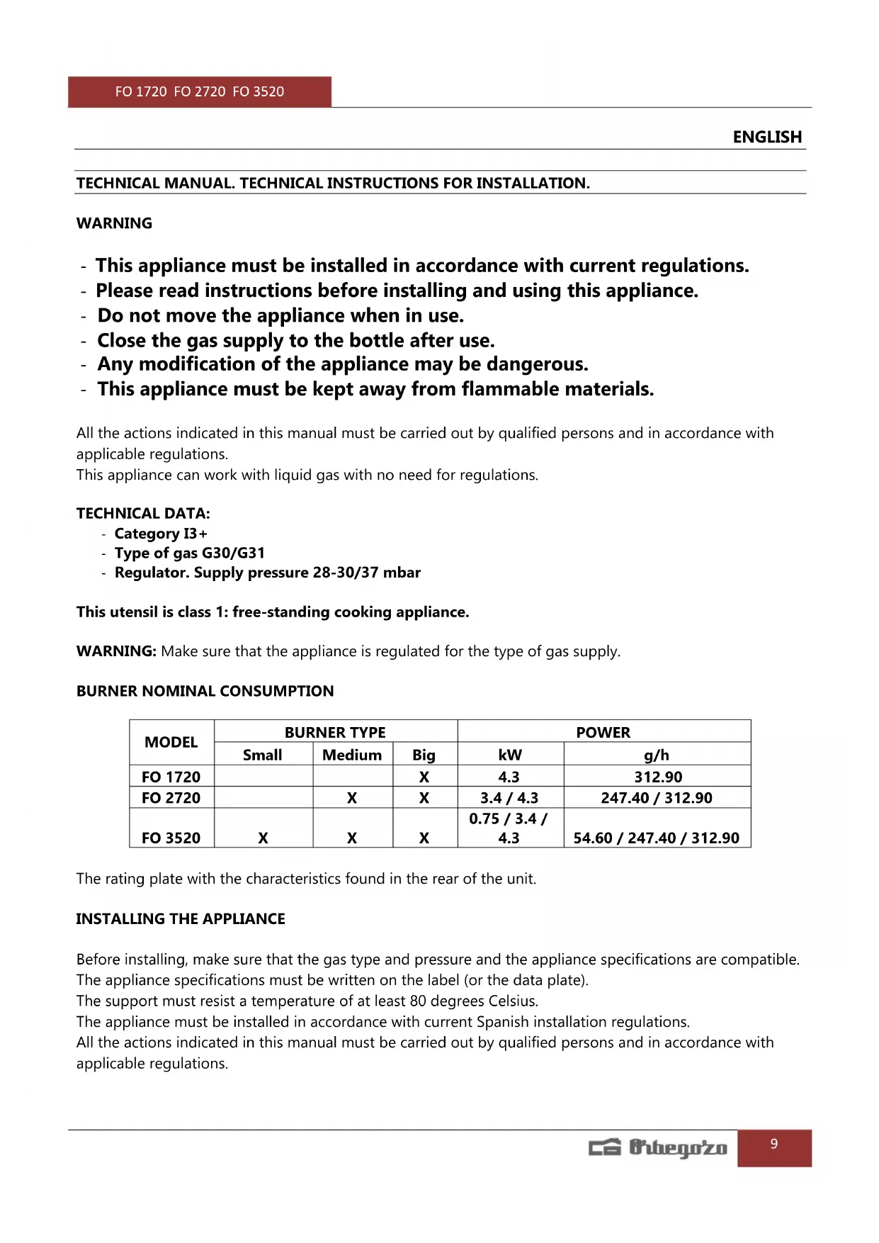 Before installing, make sure that the gas type and pressure and the appliance specifications are compatible. The appliance specifications must be written on the label (or the data plate). The support must resist a temperature of at least 80 degrees Celsius. The appliance must be installed in accordance with current Spanish installation regulations. All the actions indicated in this manual must be carried out by qualified persons and in accordance with applicable regulations.FO 1720 FO 2720 FO 3520