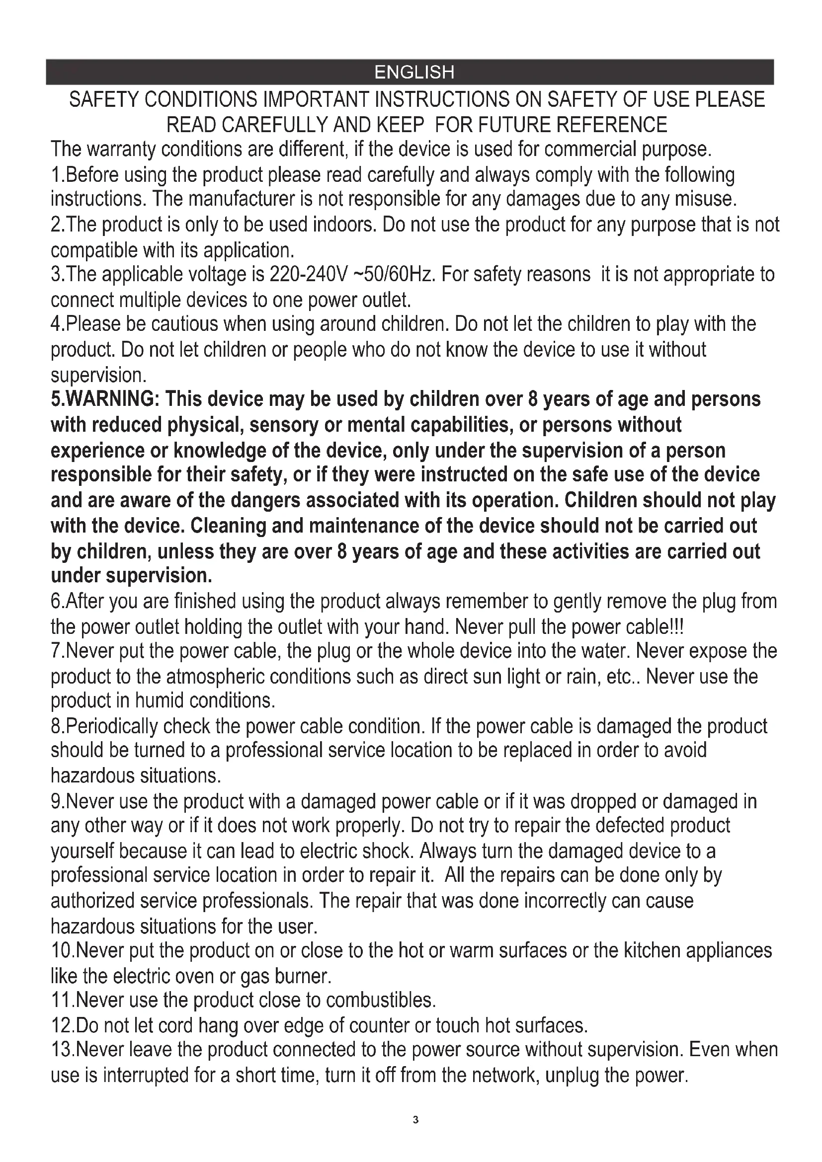 ENGLISH 1.Before using the product please read carefully and always comply with the following instructions. The manufacturer is not responsible for any damages due to any misuse. 10.Never put the product on or close to the hot or warm surfaces or the kitchen appliances like the electric oven or gas burner. 7.Never put the power cable, the plug or the whole device into the water. Never expose the product to the atmospheric conditions such as direct sun light or rain, etc.. Never use the product in humid conditions. 8.Periodically check the power cable condition. If the power cable is damaged the product should be turned to a professional service location to be replaced in order to avoid hazardous situations. 2.The product is only to be used indoors. Do not use the product for any purpose that is not compatible with its application. 13.Never leave the product connected to the power source without supervision. Even when use is interrupted for a short time, turn it off from the network, unplug the power. 6.After you are finished using the product always remember to gently remove the plug from the power outlet holding the outlet with your hand. Never pull the power cable!!! 3.The applicable voltage is 220-240V ~50/60Hz. For safety reasons it is not appropriate to connect multiple devices to one power outlet. 5.WARNING: This device may be used by children over 8 years of age and persons with reduced physical, sensory or mental capabilities, or persons without experience or knowledge of the device, only under the supervision of a person responsible for their safety, or if they were instructed on the safe use of the device and are aware of the dangers associated with its operation. Children should not play with the device. Cleaning and maintenance of the device should not be carried out by children, unless they are over 8 years of age and these activities are carried out under supervision. 9.Never use the product with a damaged power cable or if it was dropped or damaged in any other way or if it does not work properly. Do not try to repair the defected product yourself because it can lead to electric shock. Always turn the damaged device to a professional service location in order to repair it. All the repairs can be done only by authorized service professionals. The repair that was done incorrectly can cause hazardous situations for the user. The warranty conditions are different, if the device is used for commercial purpose. SAFETY CONDITIONS IMPORTANT INSTRUCTIONS ON SAFETY OF USE PLEASE READ CAREFULLY AND KEEP FOR FUTURE REFERENCE 4.Please be cautious when using around children. Do not let the children to play with the product. Do not let children or people who do not know the device to use it without supervision. 12.Do not let cord hang over edge of counter or touch hot surfaces. 11.Never use the product close to combustibles.4