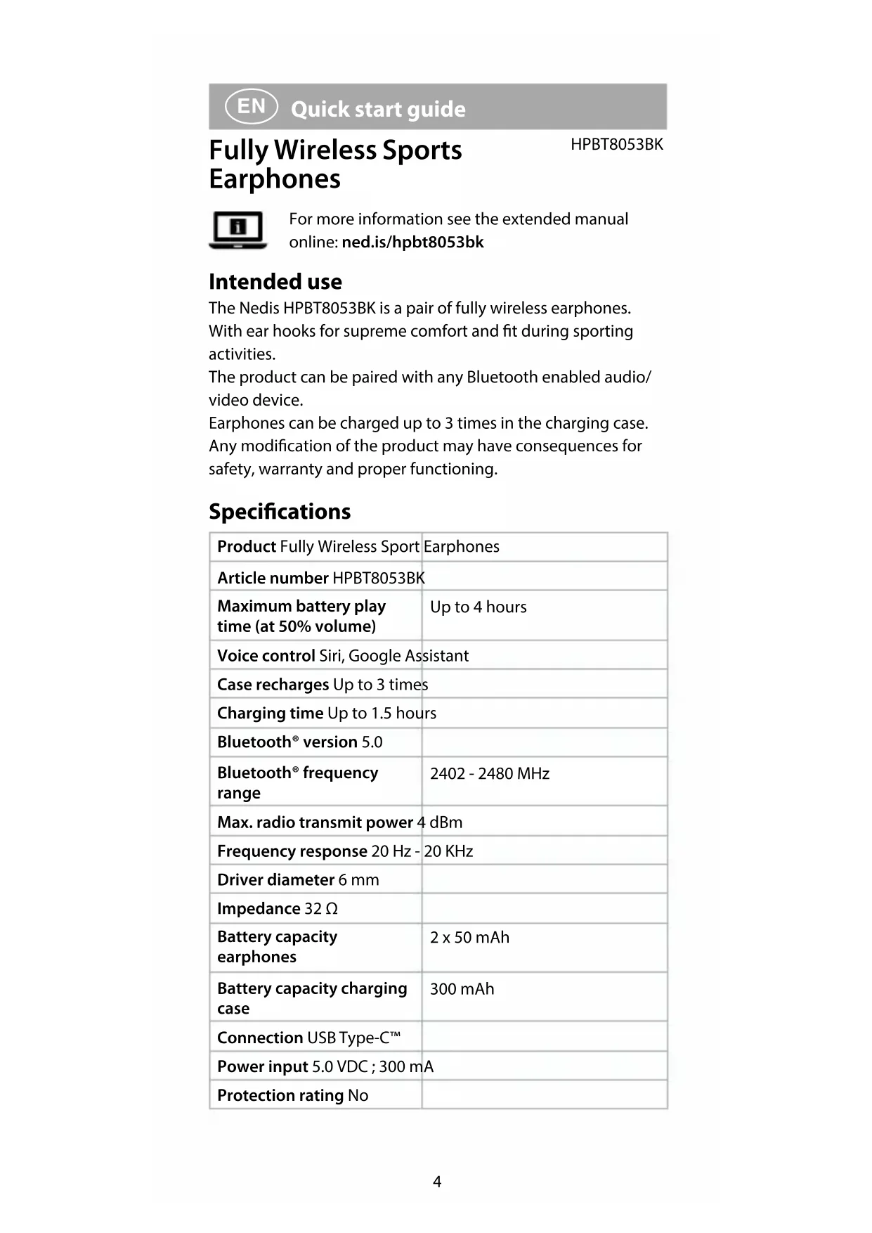 Quick start guide Fully Wireless Sports Earphones HPBT8053BK For more information see the extended manual online: ned.is/hpbt8053bk Intended use The Nedis HPBT8053BK is a pair of fully wireless earphones. With ear hooks for supreme comfort and t during sporting activities. The product can be paired with any Bluetooth enabled audio/ video device. Earphones can be charged up to 3 times in the charging case. Any modication of the product may have consequences for safety, warranty and proper functioning. Specications Product Fully Wireless Sport Earphones Article number HPBT8053BK Maximum battery play time (at 50% volume) Up to 4 hours Voice control Siri, Google Assistant Case recharges Up to 3 times Charging time Up to 1.5 hours Bluetooth® version 5.0 Bluetooth® frequency range 2402 - 2480 MHz Max. radio transmit power 4 dBm Frequency response 20 Hz - 20 KHz Driver diameter 6 mm Impedance 32 Ω Battery capacity earphones 2 x 50 mAh Battery capacity charging case 300 mAh Connection USB Type-C™ Power input 5.0 VDC ; 300 mA Protection rating No5 Main parts (image A) 1 Left earphone slot 2 Right earphone slot 3 Charging case indicator LED 4 USB Type-C™ charging port 5 Left earphone button 6 Right earphone button 7 Microphone 8 Charging indicator LED 9 Connection indicator LED q USB to USB Type-C™ cable w 2 pairs of ear tips (M) Safety instructions To prevent possible hearing damage, do not listen at high volume levels for long periods.