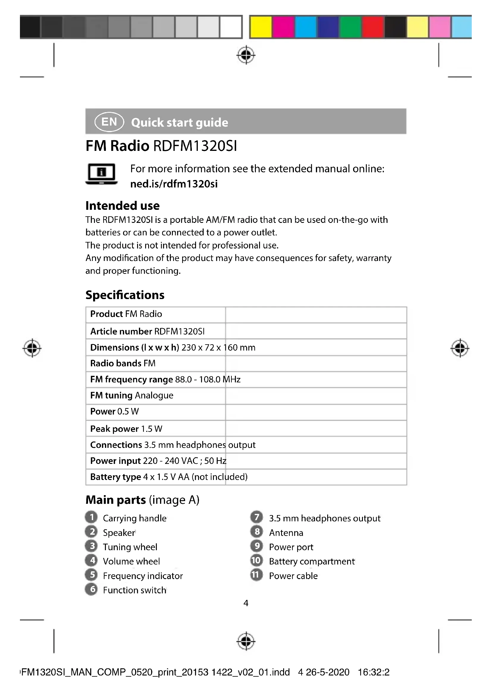 Quick start guide FM Radio RDFM1320SI For more information see the extended manual online: ned.is/rdfm1320si Intended use The RDFM1320SI is a portable AM/FM radio that can be used on-the-go with batteries or can be connected to a power outlet. The product is not intended for professional use. Any modication of the product may have consequences for safety, warranty and proper functioning. Specications Product FM Radio Article number RDFM1320SI Dimensions (l x w x h) 230 x 72 x 160 mm Radio bands FM FM frequency range 88.0 - 108.0 MHz FM tuning Analogue Power 0.5 W Peak power 1.5 W Connections 3.5 mm headphones output Power input 220 - 240 VAC ; 50 Hz Battery type 4 x 1.5 V AA (not included) Main parts (image A)