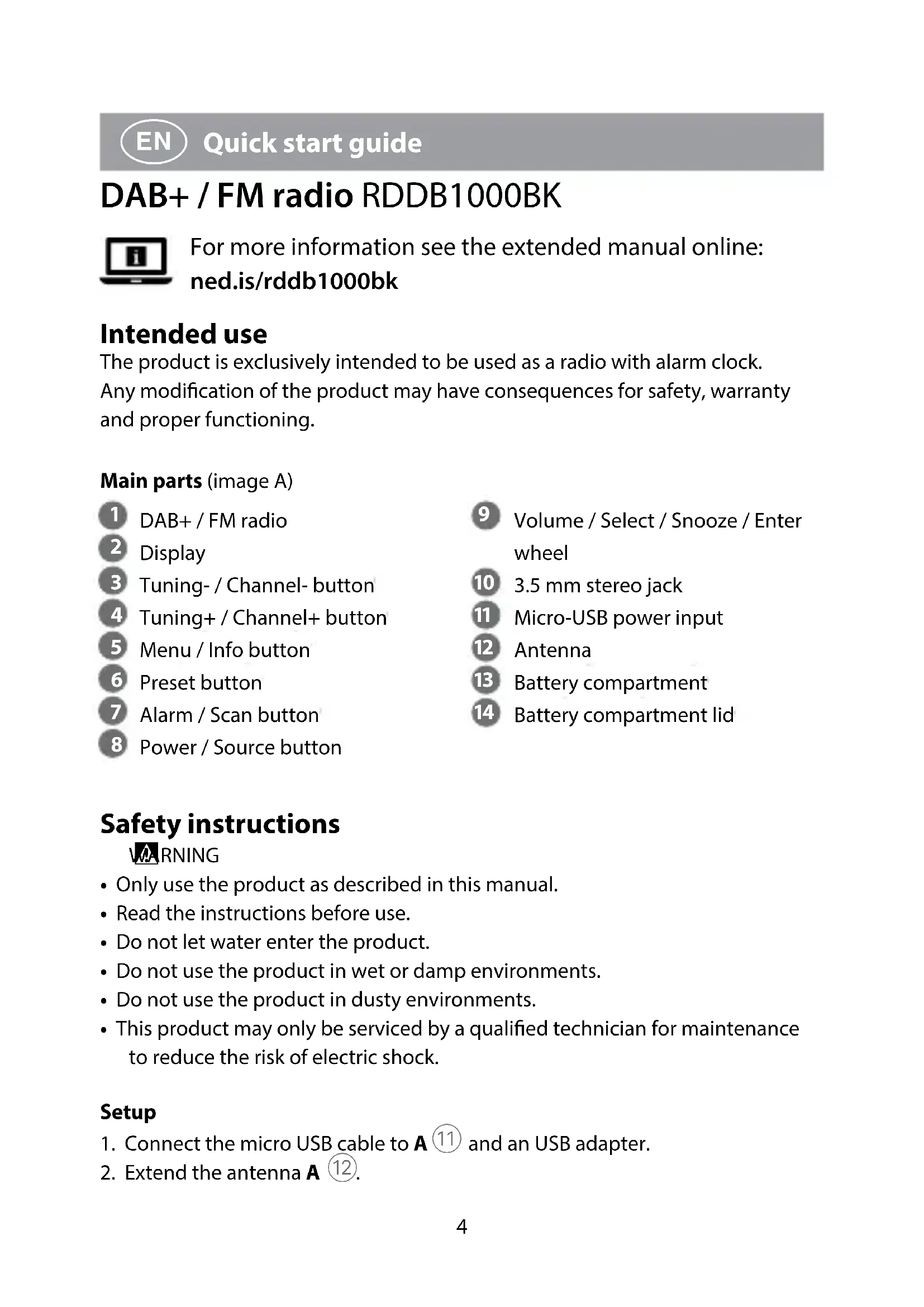 Quick start guide DAB+ / FM radio RDDB1000BK For more information see the extended manual online: ned.is/rddb1000bk Intended use The product is exclusively intended to be used as a radio with alarm clock.Any modication of the product may have consequences for safety, warranty and proper functioning.Main parts (image A) DAB+ / FM radio Display Tuning- / Channel- button Tuning+ / Channel+ button Menu / Info button Preset button Alarm / Scan button Power / Source button Volume / Select / Snooze / Enter wheel