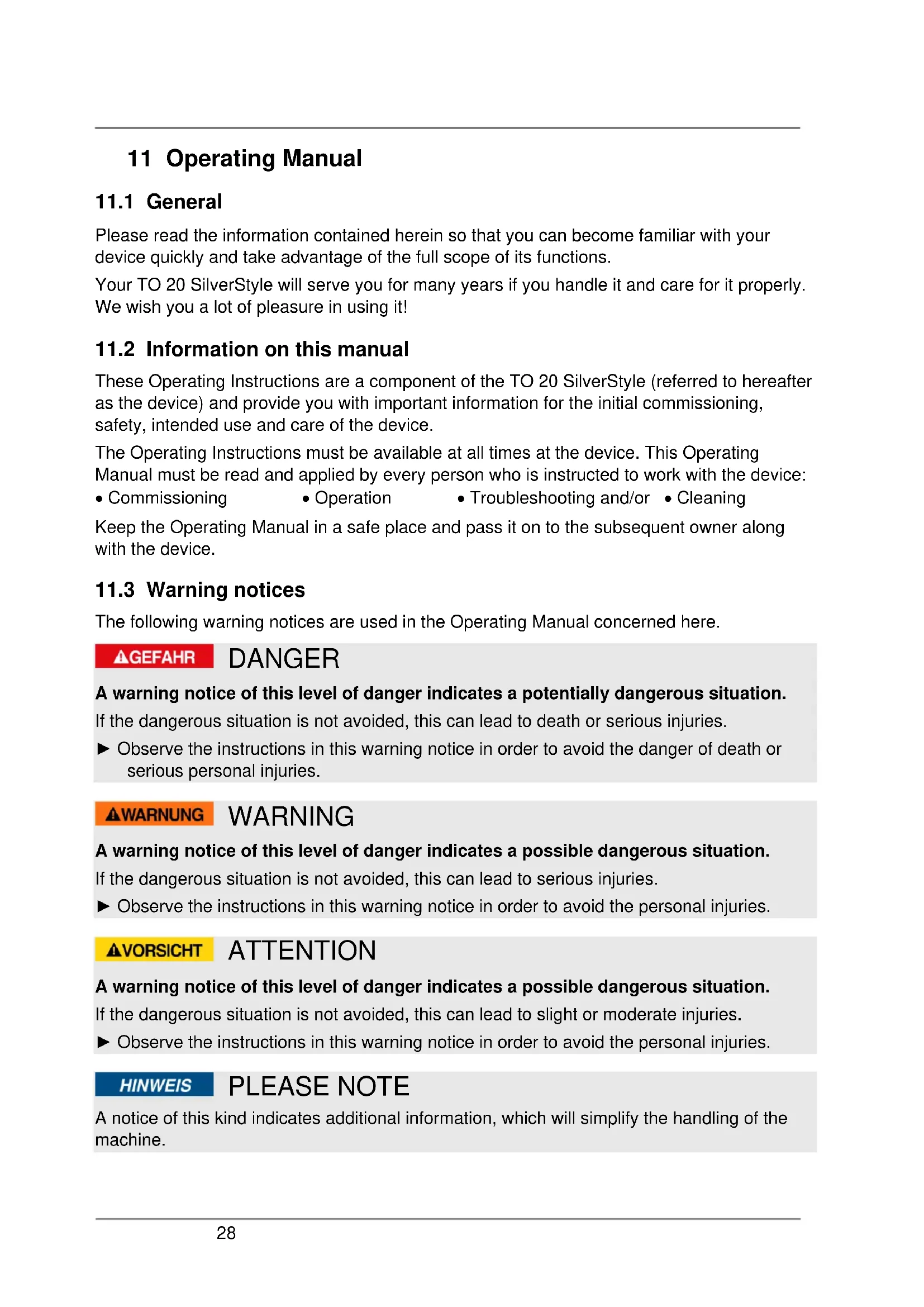 The following warning notices are used in the Operating Manual concerned here. DANGER A warning notice of this level of danger indicates a potentially dangerous situation. If the dangerous situation is not avoided, this can lead to death or serious injuries. ► Observe the instructions in this warning notice in order to avoid the danger of death or serious personal injuries. WARNING A warning notice of this level of danger indicates a possible dangerous situation. If the dangerous situation is not avoided, this can lead to serious injuries. ► Observe the instructions in this warning notice in order to avoid the personal injuries. ATTENTION A warning notice of this level of danger indicates a possible dangerous situation. If the dangerous situation is not avoided, this can lead to slight or moderate injuries. ► Observe the instructions in this warning notice in order to avoid the personal injuries. PLEASE NOTE A notice of this kind indicates additional information, which will simplify the handling of the machine.29