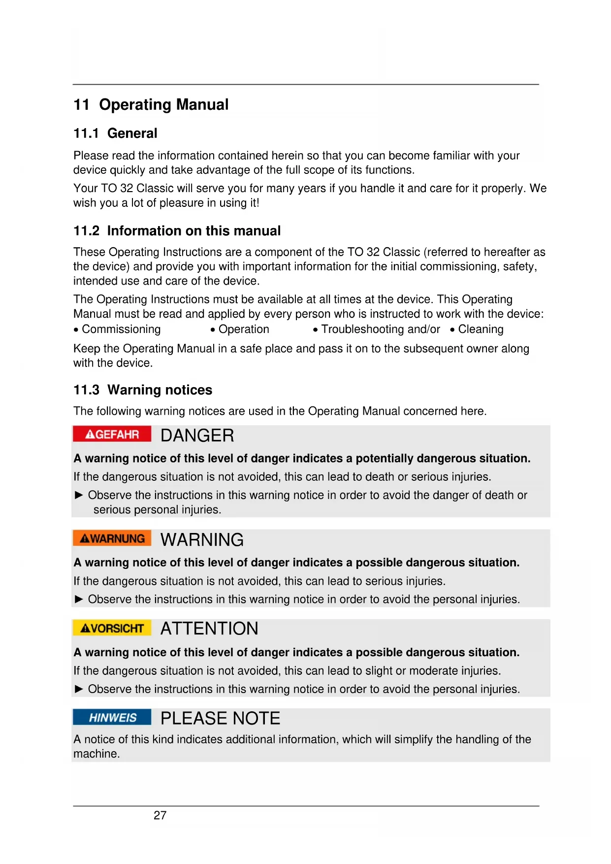 The following warning notices are used in the Operating Manual concerned here. DANGER A warning notice of this level of danger indicates a potentially dangerous situation. If the dangerous situation is not avoided, this can lead to death or serious injuries. ► Observe the instructions in this warning notice in order to avoid the danger of death or serious personal injuries. WARNING A warning notice of this level of danger indicates a possible dangerous situation. If the dangerous situation is not avoided, this can lead to serious injuries. ► Observe the instructions in this warning notice in order to avoid the personal injuries. ATTENTION A warning notice of this level of danger indicates a possible dangerous situation. If the dangerous situation is not avoided, this can lead to slight or moderate injuries. ► Observe the instructions in this warning notice in order to avoid the personal injuries. PLEASE NOTE A notice of this kind indicates additional information, which will simplify the handling of the machine.28