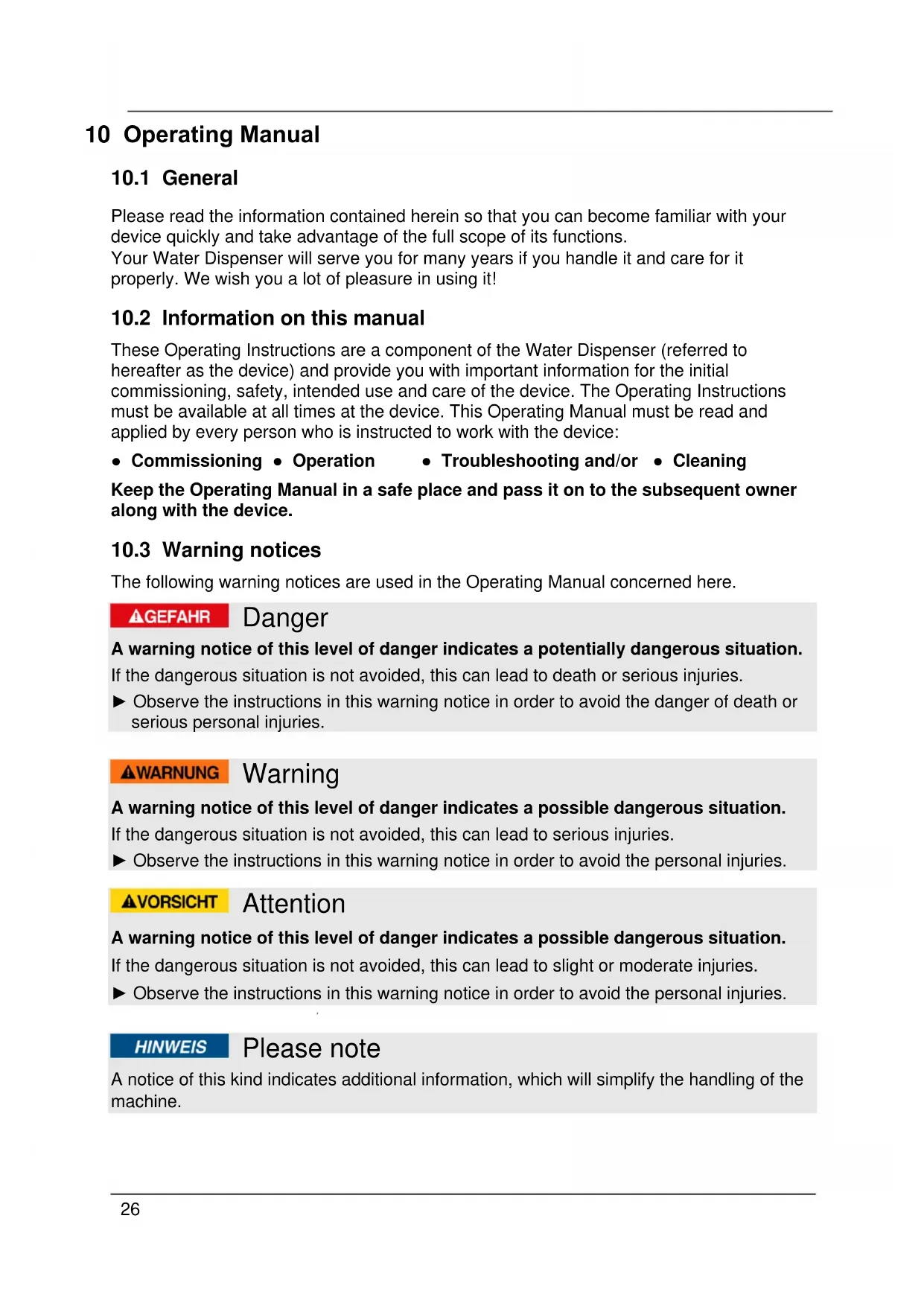 These Operating Instructions are a component of the Water Dispenser (referred to hereafter as the device) and provide you with important information for the initial commissioning, safety, intended use and care of the device. The Operating Instructions must be available at all times at the device. This Operating Manual must be read and applied by every person who is instructed to work with the device: ● Commissioning ● Operation ● Troubleshooting and/or ● Cleaning Keep the Operating Manual in a safe place and pass it on to the subsequent owner along with the device.