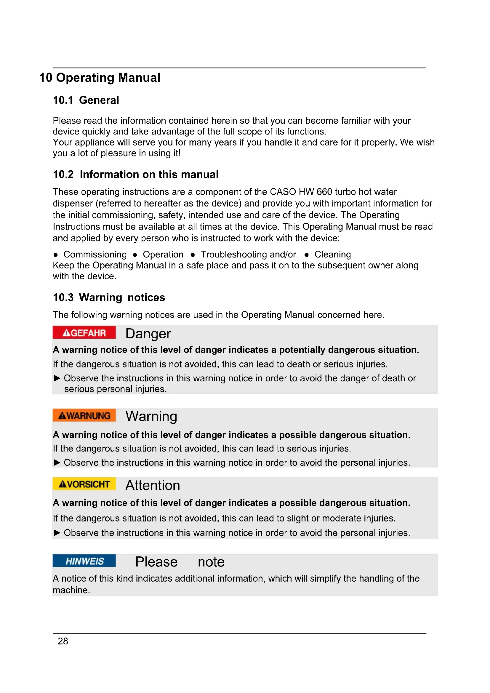 These operating instructions are a component of the CASO HW 660 turbo hot water dispenser (referred to hereafter as the device) and provide you with important information for the initial commissioning, safety, intended use and care of the device. The Operating Instructions must be available at all times at the device. This Operating Manual must be read and applied by every person who is instructed to work with the device: ● Commissioning ● Operation ● Troubleshooting and/or ● Cleaning Keep the Operating Manual in a safe place and pass it on to the subsequent owner along with the device.