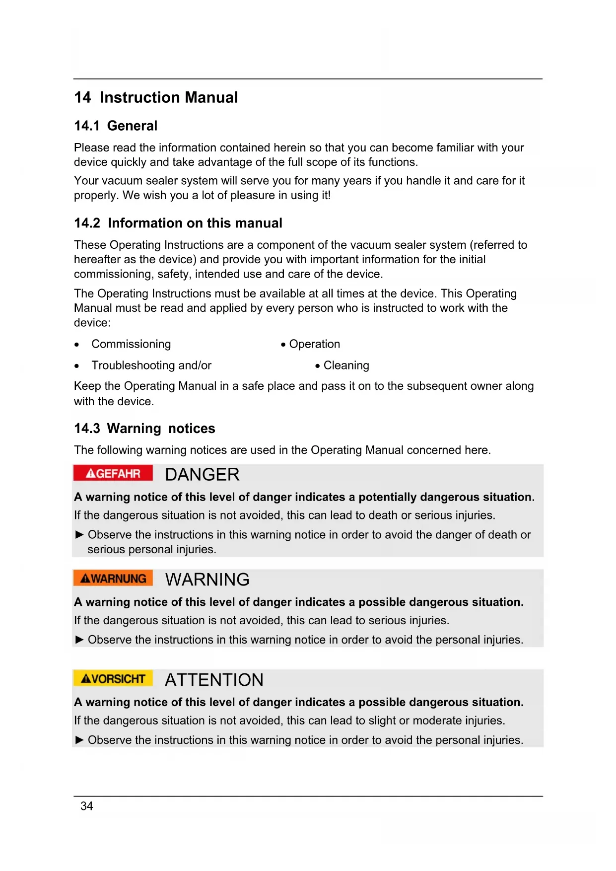 These Operating Instructions are a component of the vacuum sealer system (referred to hereafter as the device) and provide you with important information for the initial commissioning, safety, intended use and care of the device. The Operating Instructions must be available at all times at the device. This Operating Manual must be read and applied by every person who is instructed to work with the device: Commissioning Operation Troubleshooting and/or Cleaning Keep the Operating Manual in a safe place and pass it on to the subsequent owner along with the device.