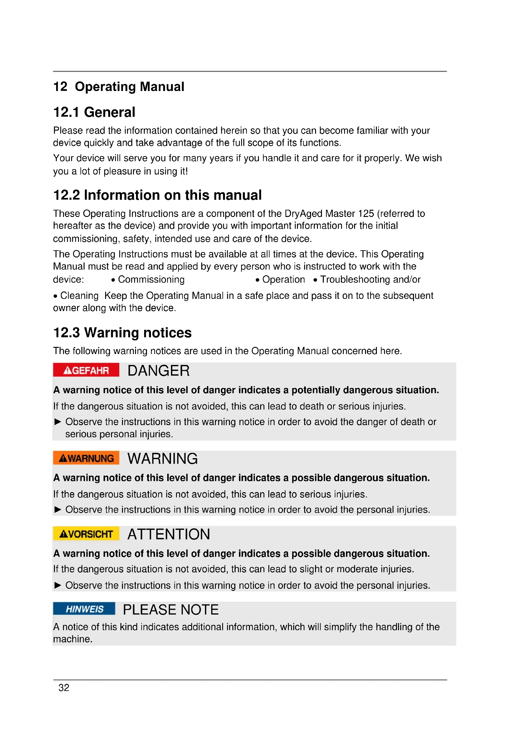 PLEASE NOTE Please observe the following general safety notices with regard to the safe handling of the device. ► Examine the device for any visible external damages prior to using it. Never put a damaged device into operation. ► If the power cable or plug are damaged, then they must be replaced by the manufacturer or its service agent in order to avoid a hazard. ► This device must not be used by children. The appliance and its connecting cable must be kept away from children. ► Children shall not play with the appliance. ► Cleaning and user maintenance shall not be made by children. ► The appliance may be used by individuals with reduced physical, sensory or mental capabilities or a lack of experience and / or knowledge of their use if they are supervised or have been instructed at to the safe use of the appliance and have understood the resulting hazards. Cleaning and user maintenance shall not be made by children. ► Do not leave the device unsupervised when it is in operation. ► The equipment is not a refrigerator. Do not use the equipment to store foods other than those mentioned under "Intended use". ► The equipment is not suitable for the smoking of meat. ► Only customer service departments authorized by the manufacturer may carry out repairs on the device, as otherwise the guarantee entitlements will be null and void in the event of any subsequent damages. Improperly performed repairs can cause considerable dangers for the user.35 PLEASE NOTE ► Defective components must always be replaced with original replacement parts. Only such parts will guarantee that the safety requirements are fulfilled. ► The device actively regulates the desired humidity. Do not use salt blocks for regulation of humidity in the device. The device could be damaged. If, nevertheless salt blocks are used, the guarantee of the device expires. The manufacturer asumes no guarantee for damages of device or meat.