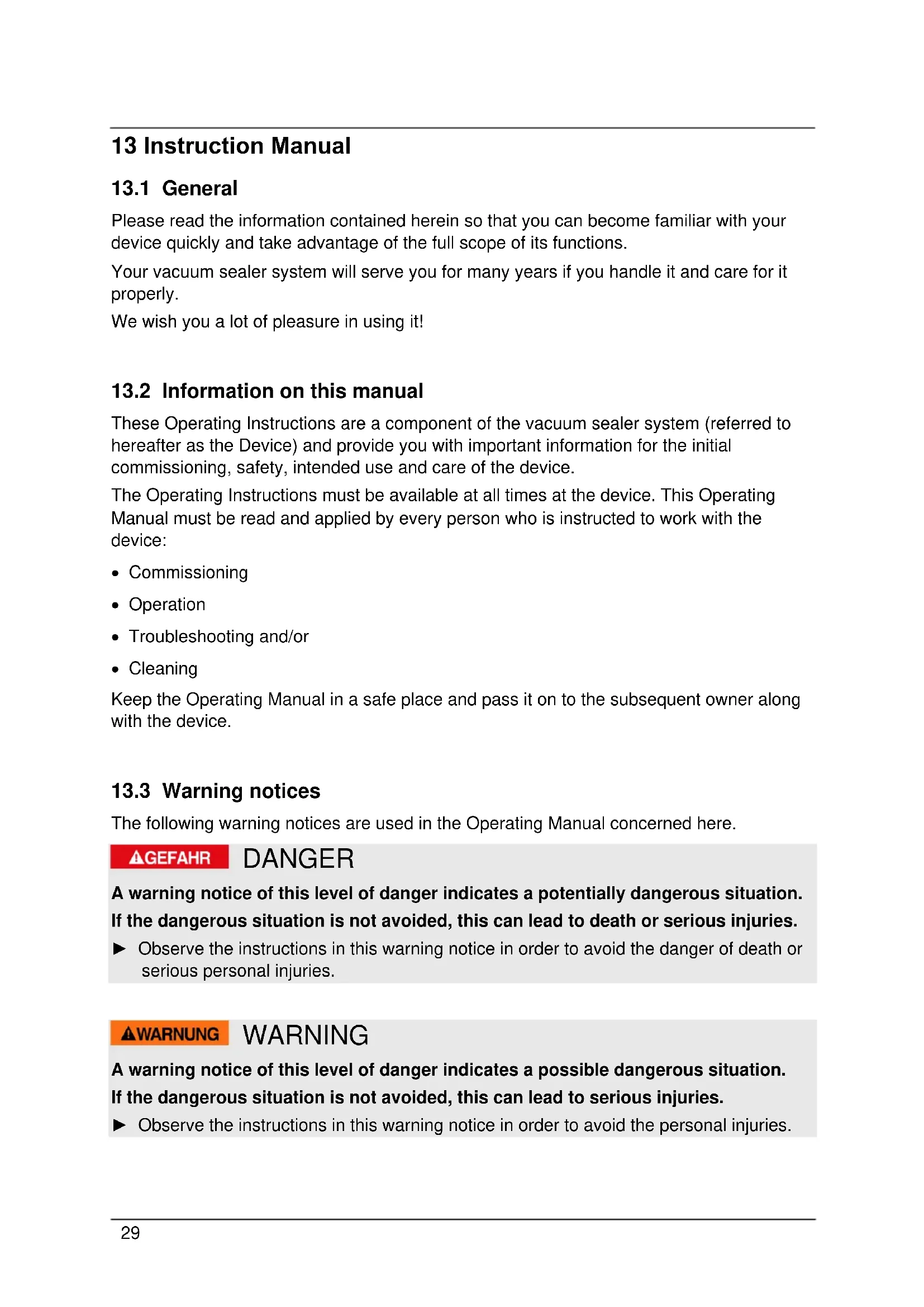 These Operating Instructions are a component of the vacuum sealer system (referred to hereafter as the Device) and provide you with important information for the initial commissioning, safety, intended use and care of the device. The Operating Instructions must be available at all times at the device. This Operating Manual must be read and applied by every person who is instructed to work with the device: Commissioning Operation Troubleshooting and/or Cleaning Keep the Operating Manual in a safe place and pass it on to the subsequent owner along with the device.