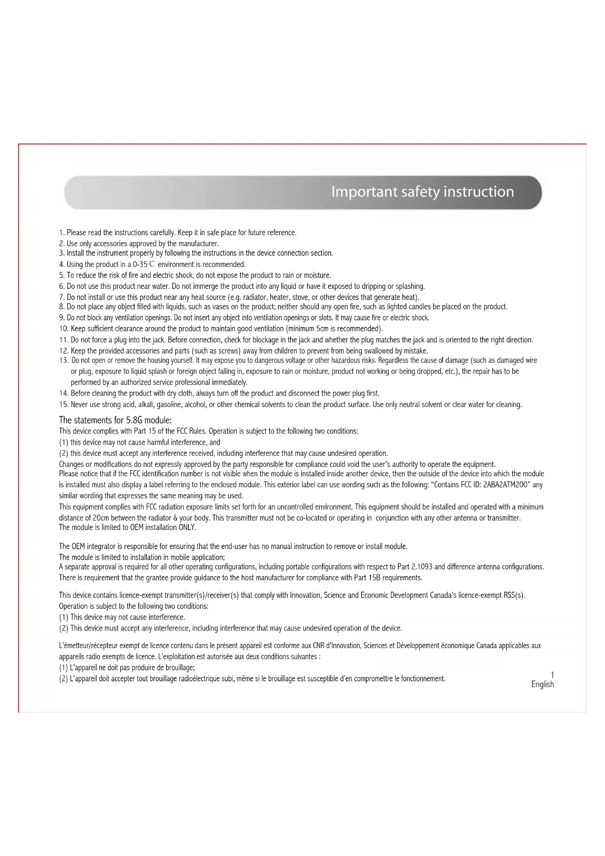 15. Never use strong acid, alkali, gasoline, alcohol, or other chemical solvents to clean the product surface. Use only neutral solvent or clear water for cleaning. This device contains licence-exempt transmitter(s)/receiver(s) that comply with Innovation, Science and Economic Development Canada’s licence-exempt RSS(s). Operation is subject to the following two conditions: (1) This device may not cause interference. (2) This device must accept any interference, including interference that may cause undesired operation of the device. L’émetteur/récepteur exempt de licence contenu dans le présent appareil est conforme aux CNR d’Innovation, Sciences et Développement économique Canada applicables aux appareils radio exempts de licence. L’exploitation est autorisée aux deux conditions suivantes : (1) L’appareil ne doit pas produire de brouillage; (2) L’appareil doit accepter tout brouillage radioélectrique subi, même si le brouillage est susceptible d’en compromettre le fonctionnement. The OEM integrator is responsible for ensuring that the end-user has no manual instruction to remove or install module. The module is limited to installation in mobile application; A separate approval is required for all other operating configurations, including portable configurations with respect to Part 2.1093 and difference antenna configurations. There is requirement that the grantee provide guidance to the host manufacturer for compliance with Part 15B requirements. This device complies with Part 15 of the FCC Rules. Operation is subject to the following two conditions: (1) this device may not cause harmful interference, and (2) this device must accept any interference received, including interference that may cause undesired operation. Changes or modifications do not expressly approved by the party responsible for compliance could void the user’s authority to operate the equipment. Please notice that if the FCC identification number is not visible when the module is installed inside another device, then the outside of the device into which the module is installed must also display a label referring to the enclosed module. This exterior label can use wording such as the following: “Contains FCC ID: 2ABA2ATM200” any similar wording that expresses the same meaning may be used. This equipment complies with FCC radiation exposure limits set forth for an uncontrolled environment. This equipment should be installed and operated with a minimum distance of 20cm between the radiator & your body. This transmitter must not be co-located or operating in conjunction with any other antenna or transmitter. The module is limited to OEM installation ONLY. The statements for 5.8G module:Important safety instruction